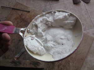 Корыто с остатками воды уже можно извлечь из шлифмашины. Аккуратно сливаю остатки воды и резиновым шпателем выгребаю слой шлама. Если дать ему отстояться неделю-две – летом нам в деревне не до витражей, то слой уплотняется до консистенции холодного сливочного масла. Корыто отмываю от остатков, собираю и заправляю машину водой, мокрый стеклянный шлам выгружаю в плоскую посудину и ставлю в теплое место на печи. Через несколько дней сухую стеклянную пыль можно собирать и паковать. Высыхает она в виде непрочной корочки без труда отстающей от гладкой поверхности (Фото 5, 6).