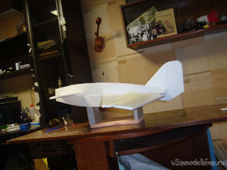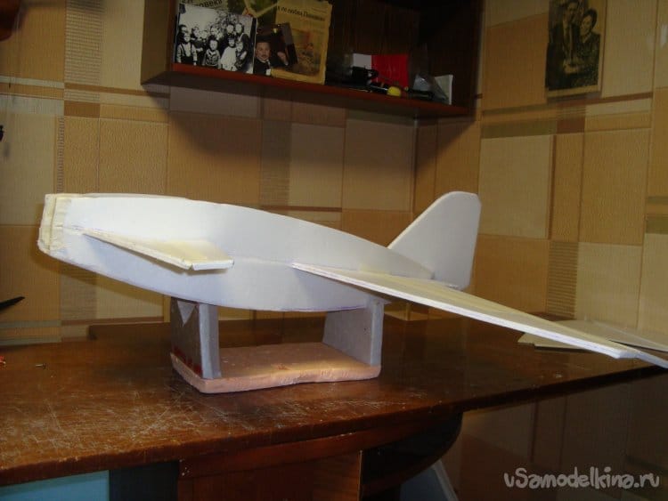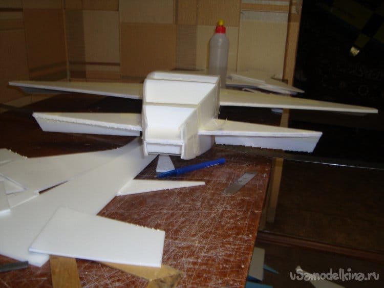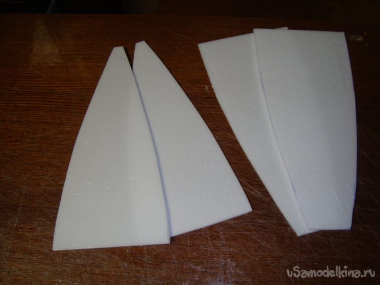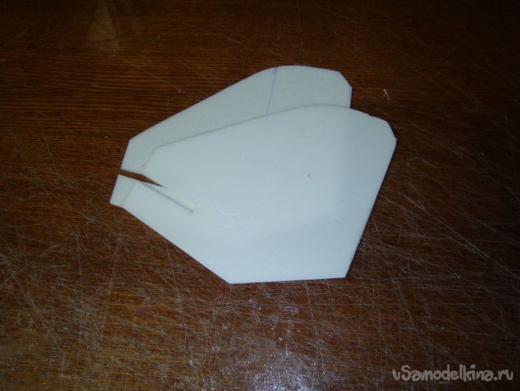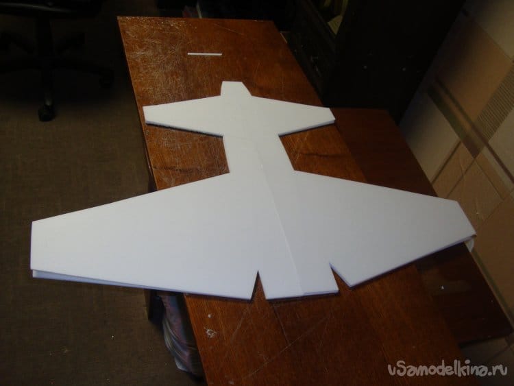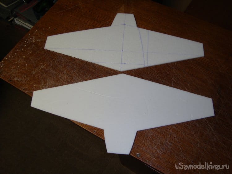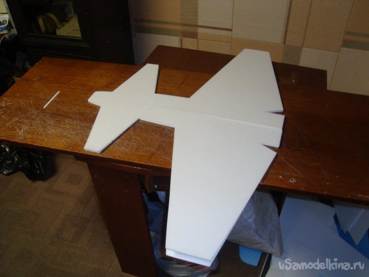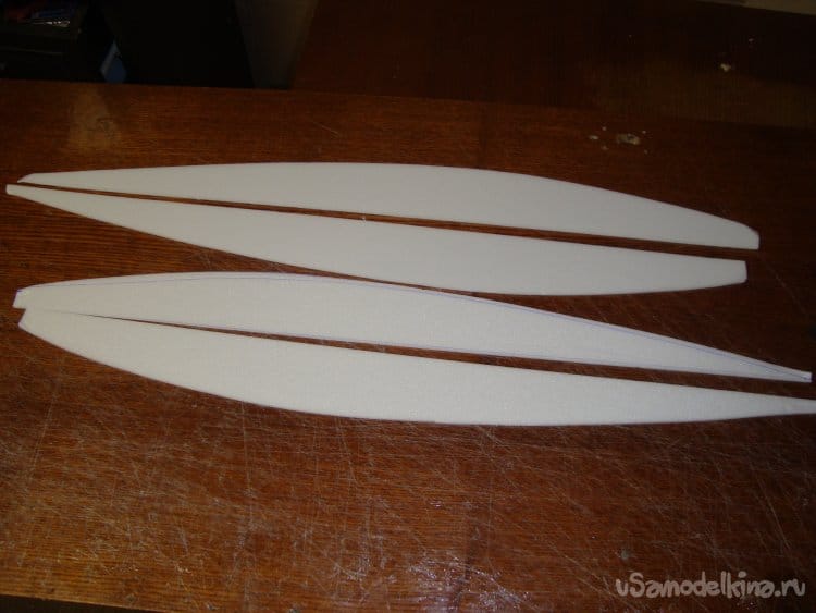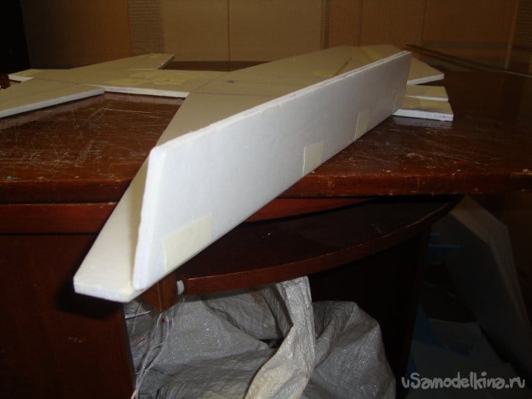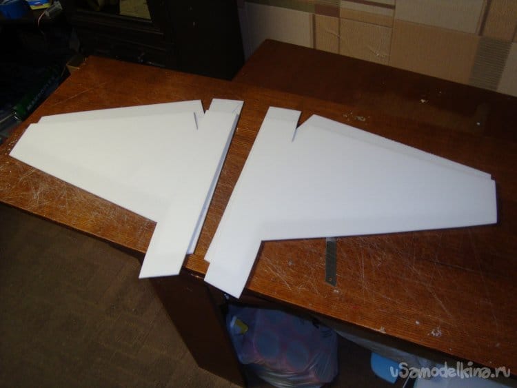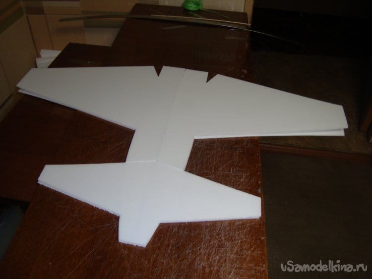 Первыми вырезал заготовки правой и левой половинки крыла и фрагментами хвостовой части фюзеляжа. Поскольку все детали делаются из двух слоёв потолочной плитки, их получилось – 4 штуки.