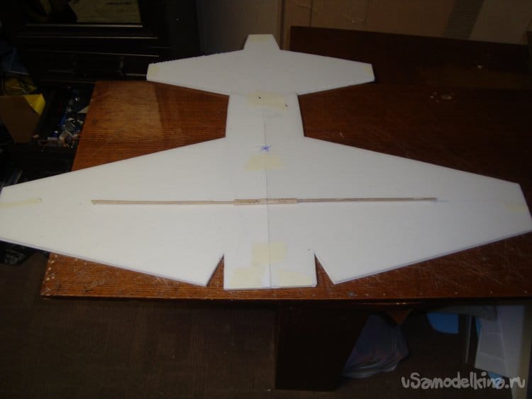 Склеил заготовки крыла и ПГО, крыло усилил деревянной реечкой , сечением 4 х 2 мм , вырезанной из ученической линейки и вклеил по всему размаху крыла.