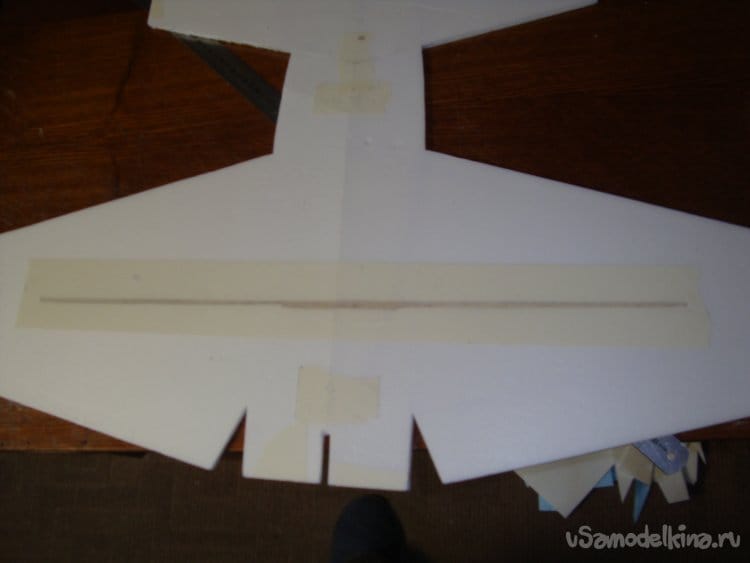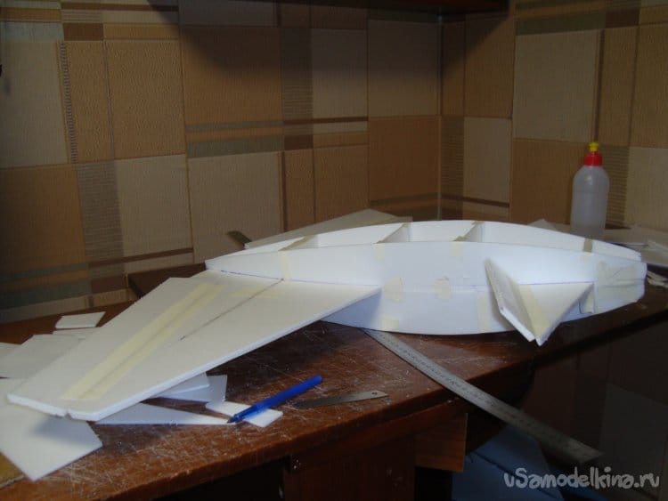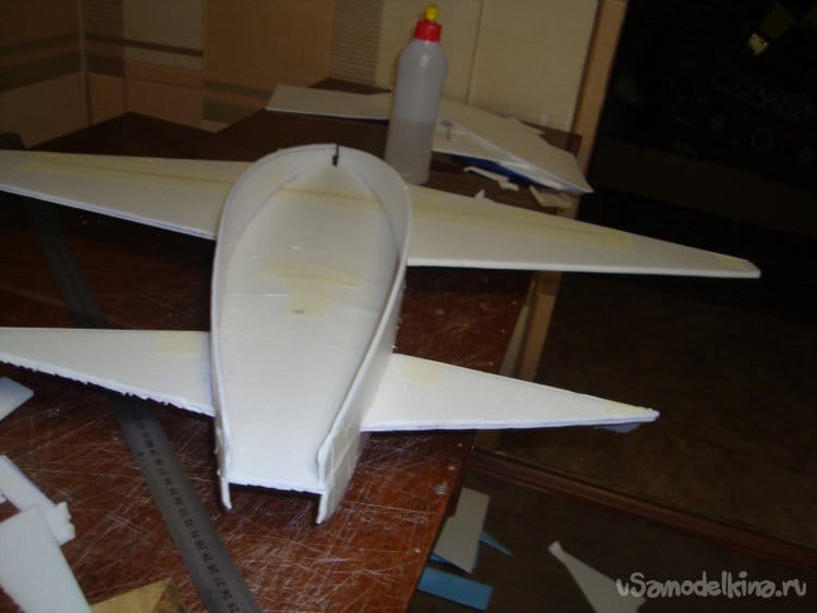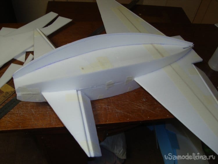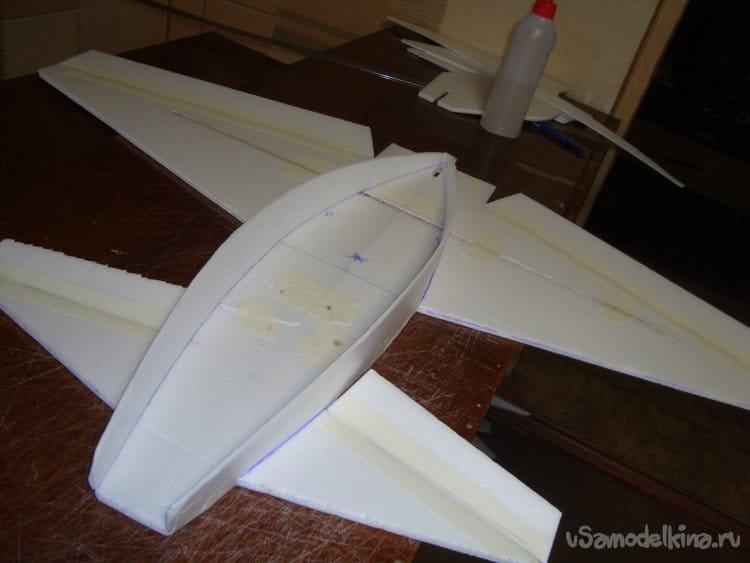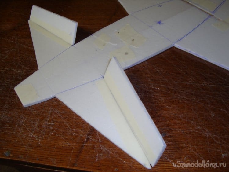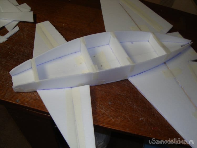 Скрепил все детали бумажным малярным скотчем, вставил в заготовленную прорезь киль и определил место нахождения ЦТ модели. Кстати модель очень неплохо планирует.