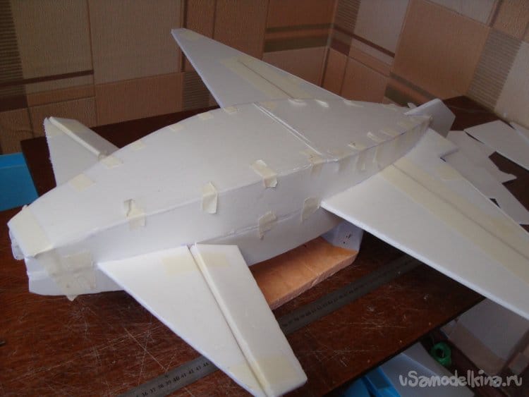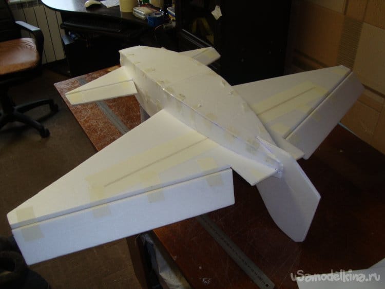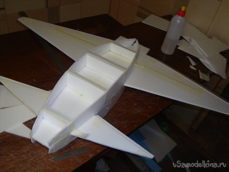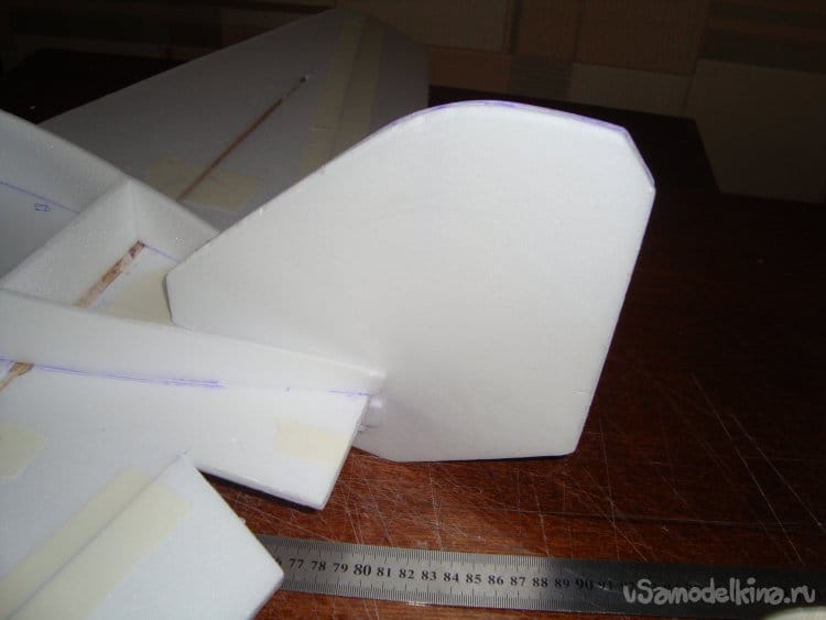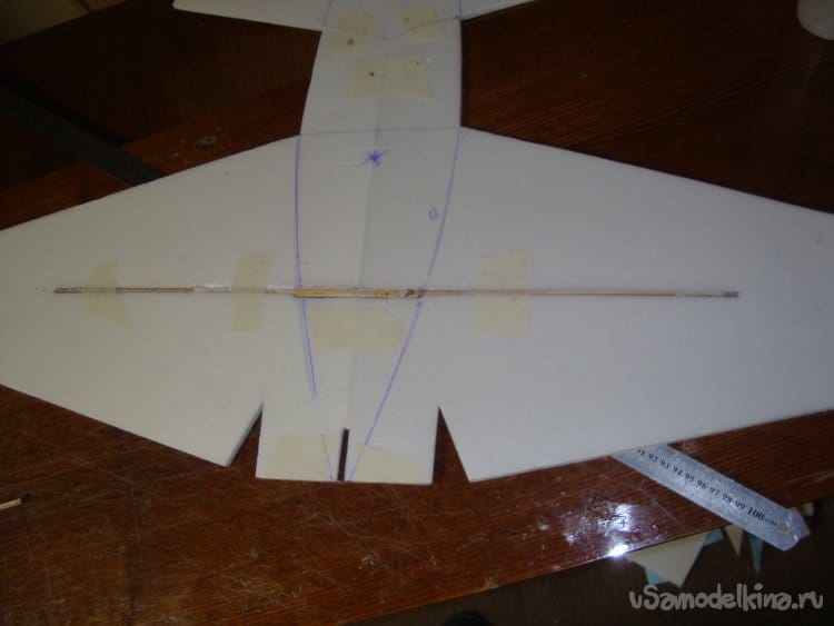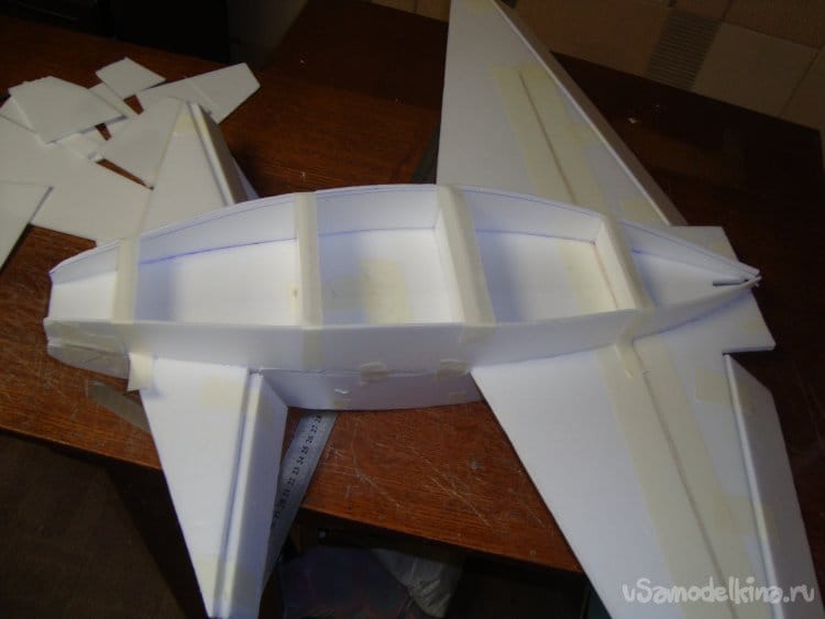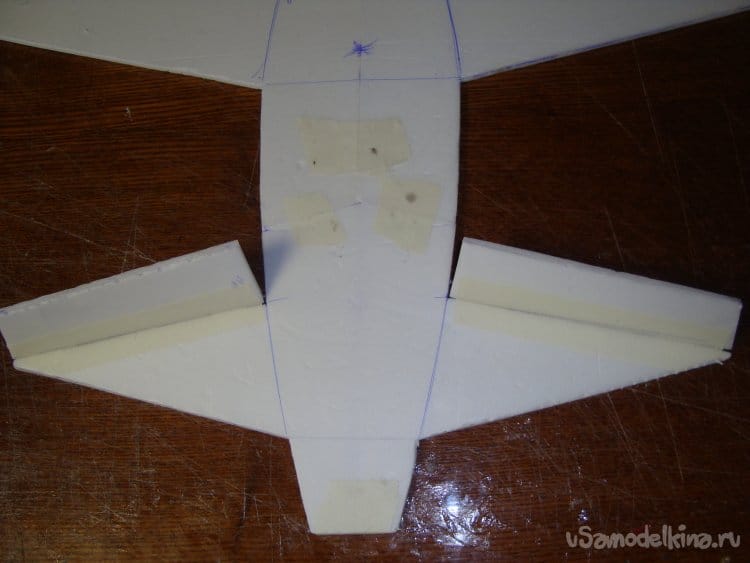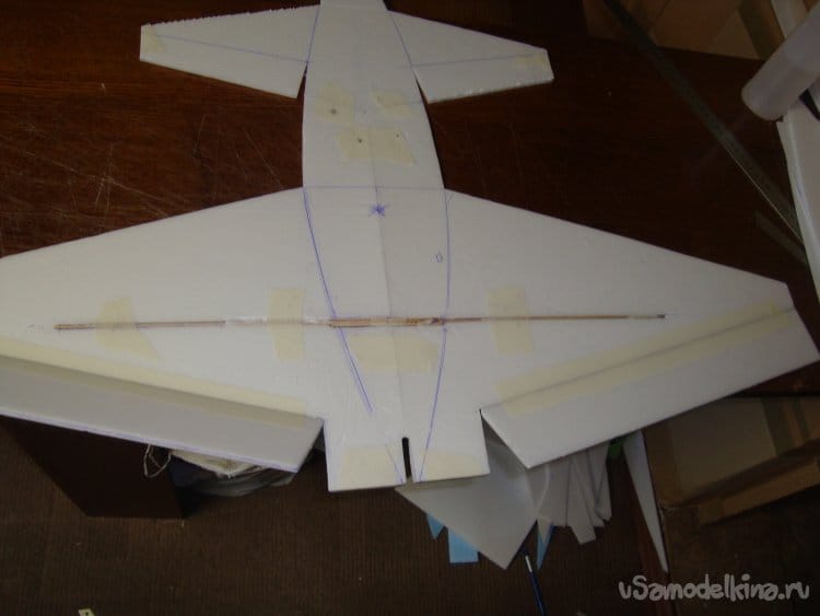 Скрепил все детали бумажным малярным скотчем, вставил в заготовленную прорезь киль и определил место нахождения ЦТ модели. Кстати модель очень неплохо планирует.