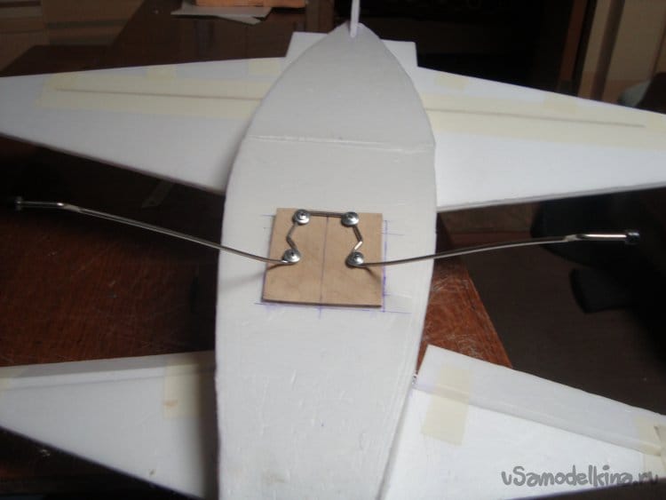 С нижней стороны приклеил кусочек фанерки, толщиной 3 мм. , на которую смонтировал стойки шасси.