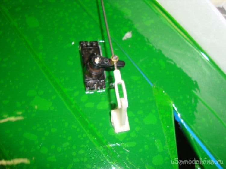 Устанавливаю сервомашинки на руль высоты (ПГО), вклеиваю кабанчики, подсоединяю тяги.