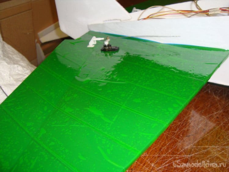 Монтирую сервомашинки на элероны, вклеиваю кабанчики, подсоединяю тяги.