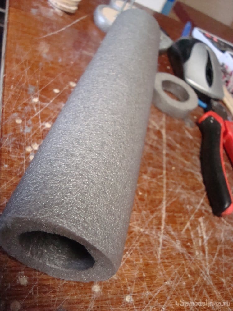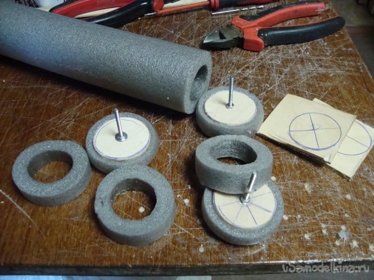 Колеса сделаны из фанеры и утеплителя для труб водяного отопления.