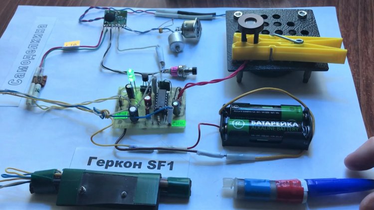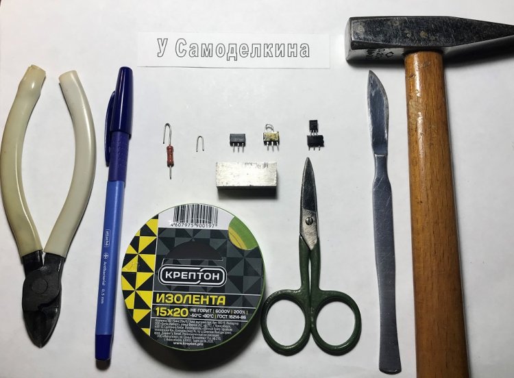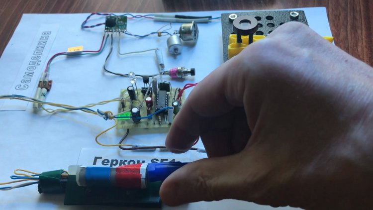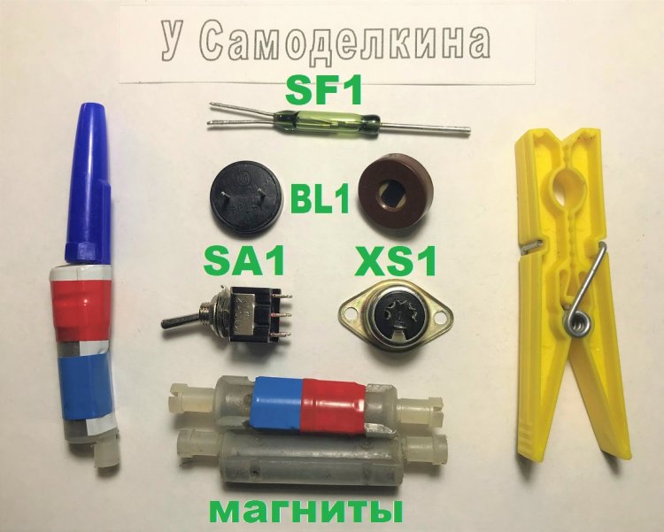 Для моделирования принципа работы УЛЭ на столе используются геркон SF1 и постоянный магнит, снятые на время с выходной двери. Магнит (нижний на рисунке 8) для лучшей узнаваемости обёрнут несколькими слоями синей и красной изоленты. А для удобства перемещения магнита, к нему дополнительно примотан колпачок от шариковой ручки. Функция бельевой прищепки – направлять фоторезистор BL1 точно на лампу светильника во время съёмки видео. Остальные детали легко ассоциируются (сопоставляются) со схемой по их позиционным буквенным обозначениям.