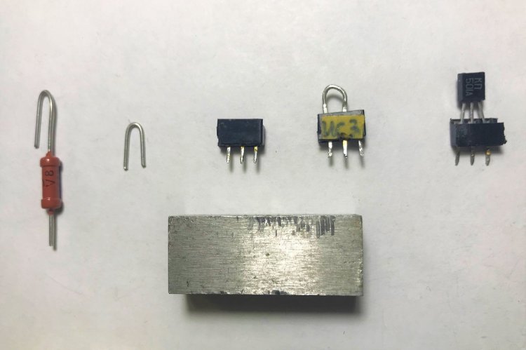 В УЛЭ применены резисторы типа С2-23, С1-4, С2-33, ОМЛТ с мощностью рассеивания 0,125 Ватт. Фоторезистор BL1 – любой, с темновым сопротивлением не менее 1 мегома, например, ФСД-1, ФСК-1. Конденсаторы С4, С6 керамические типа КМ, остальные - оксидные К50 - 35 или зарубежного производства. Конденсатор С5 должен иметь малый ток утечки. Таким требованиям отвечают, например, конденсаторы серии CFM фирмы «Маrоn» или серии ТК фирмы Jamicon. Транзистор VT1 КП505А можно заменить КП505Г и даже мощным типа IRF540. Микросхема DD1 К561ТЛ1 может быть заменена зарубежной CD4093А. Светодиод HL1 - любой суперяркий, например ARL-5213 PGC (зелёный, 5 мм., 20 мА, 3 … 3,5 Вольт, 12 кд). DA1 - модуль производства КНР LXB18 6 10 20. Батарея GB1 – 2 гальванических элемента типоразмера АА-size. Тумблер SA1 - MTS102, SMTS102 или любой другой миниатюрный. Геркон SF1 типа «тройник».