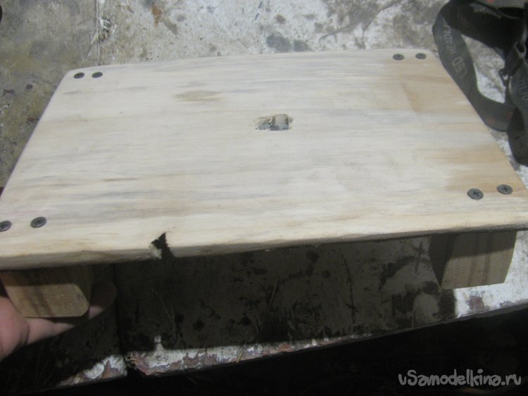 Делаем ножки, для этого я нарезал бруски и отшлифовал. Ну а далее сверлим в столешнице отверстия и прикручиваем ножки саморезами. Не будет лишним приклеить или прибить к ножкам резинки, чтобы станок не скользил по столу.