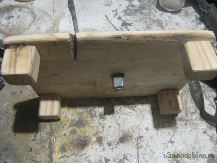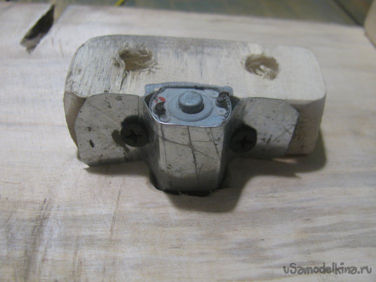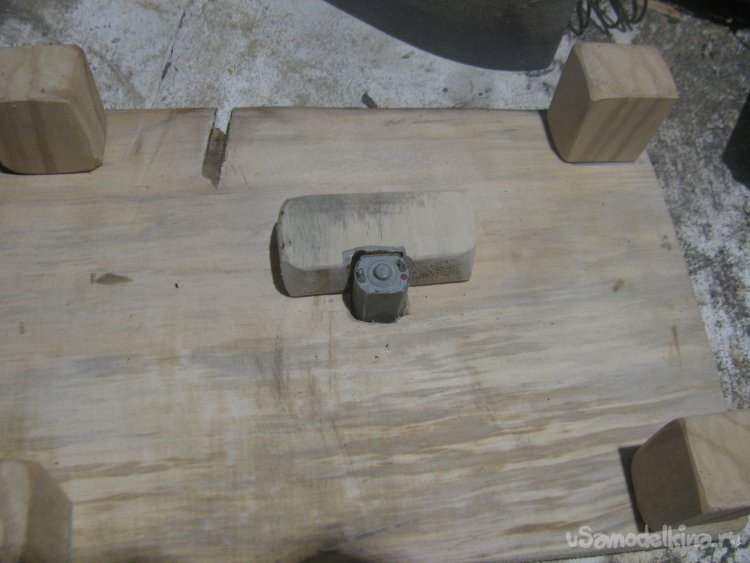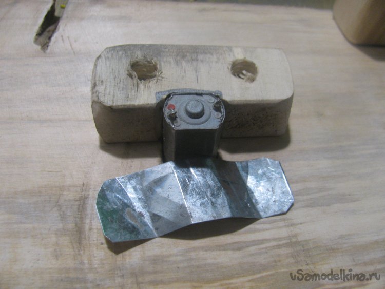 Далее прикручиваем моторчик, тут желательно, чтобы мотор можно было двигать, чтобы потом отрегулировать выход вала. Вырезал болгаркой в брусочке паз под мотор и прикрутил брусок к столешнице. Далее к этому бруску прикрутил жестянку саморезами, которая притянула мотор к бруску. Вполне можно использовать не жестянку, а кусок от ПЭТ бутылки или что-то подобное.