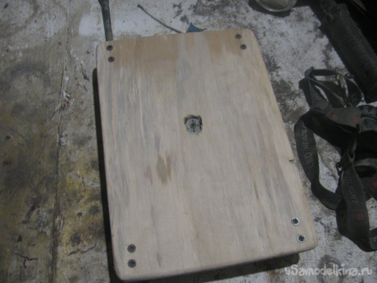 Далее в центре сверлим отверстие под моторчик, высверливаем окно такого размера, чтобы в столешницу зашел моторчик.