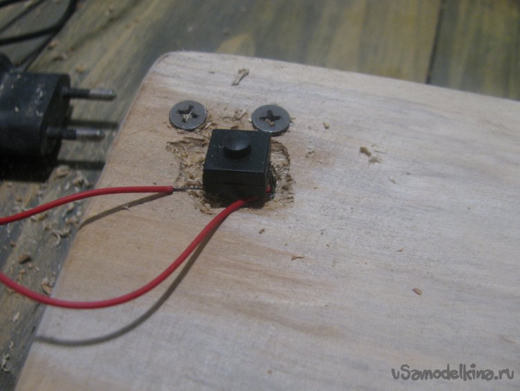 Устанавливаем на столешницу кнопку включения, она у меня от фонарика, немного жестковата, но доча справляется. Выдолбил сверлом углубление в столешнице и просверлил отверстие под провода. Ну а далее кнопка просто впаивается на горячий клей.