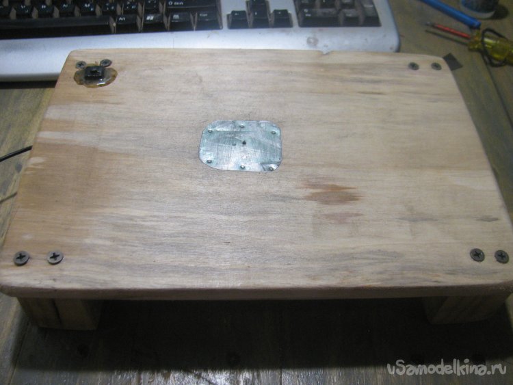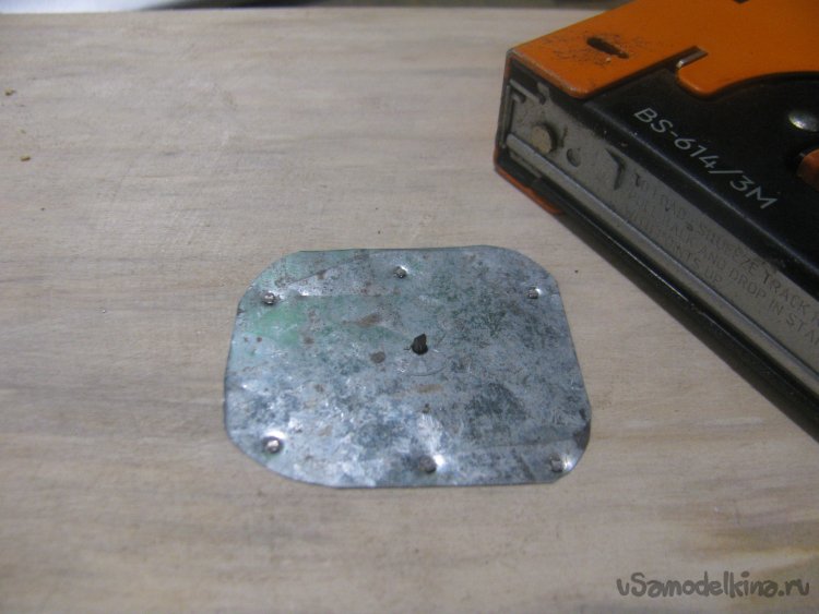 Накрываем мотор сверху, тут понадобится кусок жести, можно вырезать из консервной банки, главное ошлифовать острые края, чтобы ничего не резалось и не торчало. Ну а далее я прибил пластину своим гвоздометным степплером к столешнице.