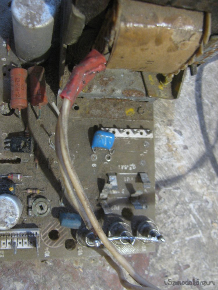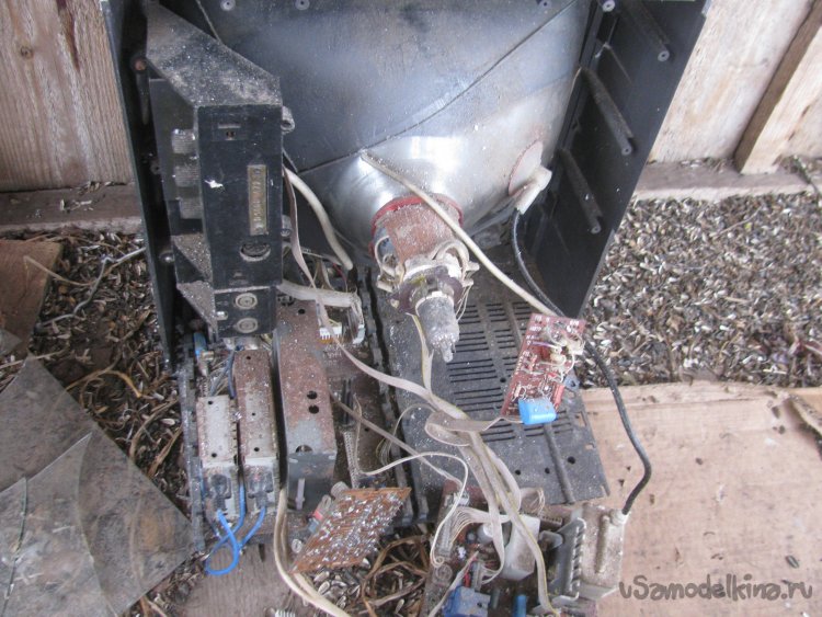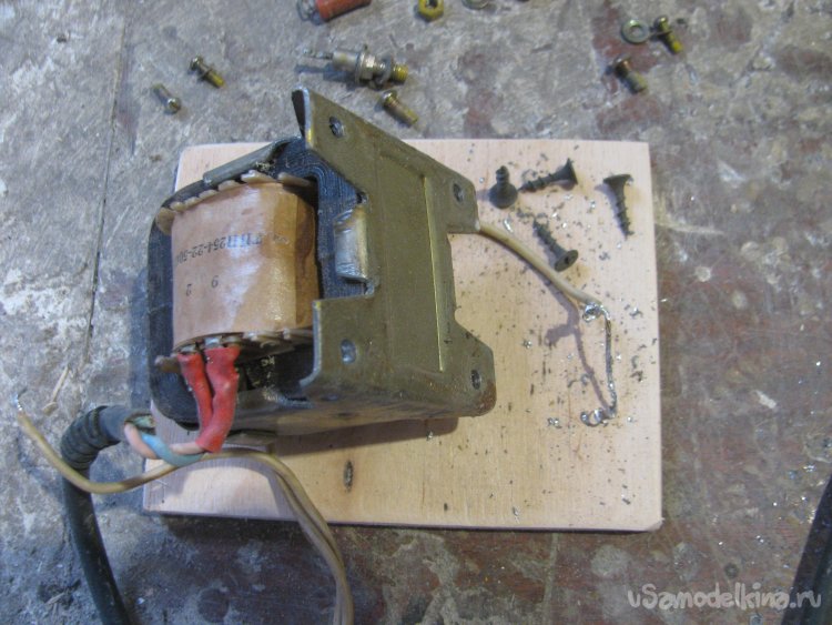 Разбираем телевизор, откручиваем все лишнее, все крепления с трансформатора были сняты, а отверстия рассверлены под саморезы. Также с платы снимаем три диода и пару резисторов для подключения лампочки.