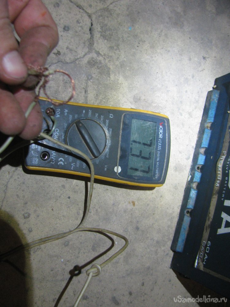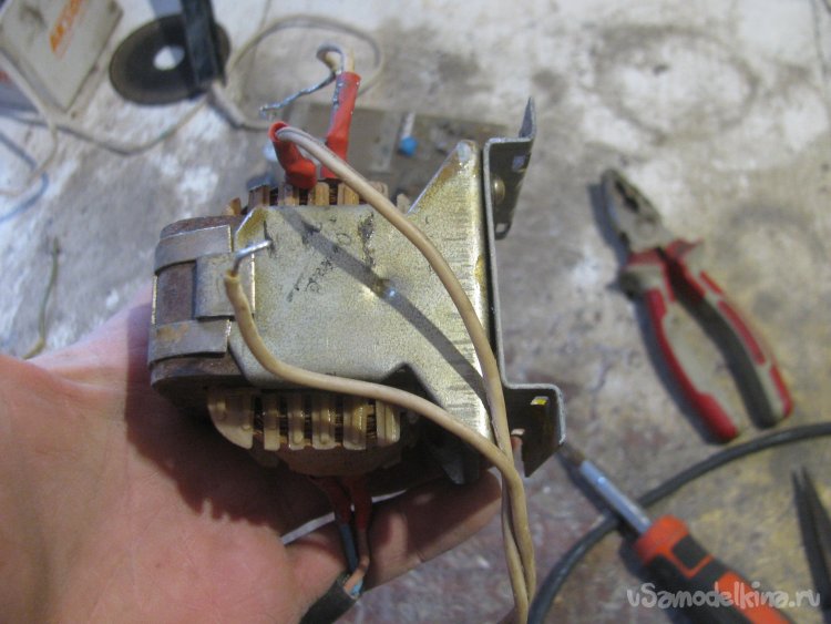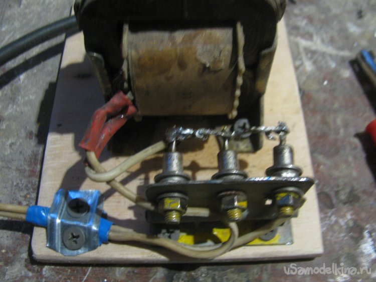 Плюс я нашел путем опыта, если при подключении к АКБ трансформатор уходит в КЗ, значит, полярность перепутана. На плюсе я завязал узелок, потом поставляю крокодилы.