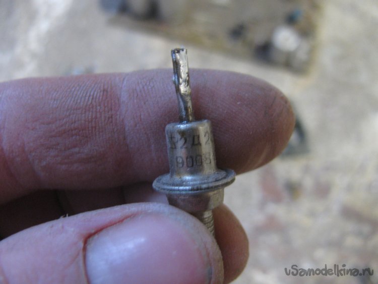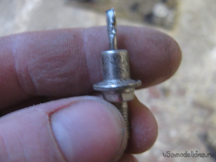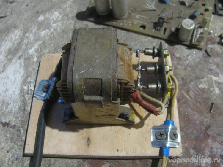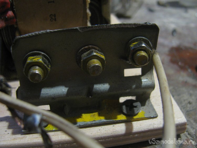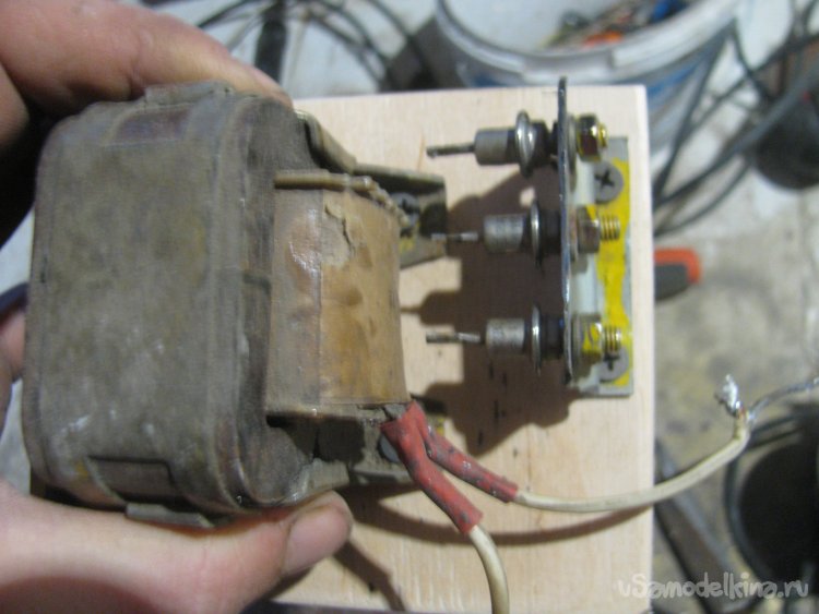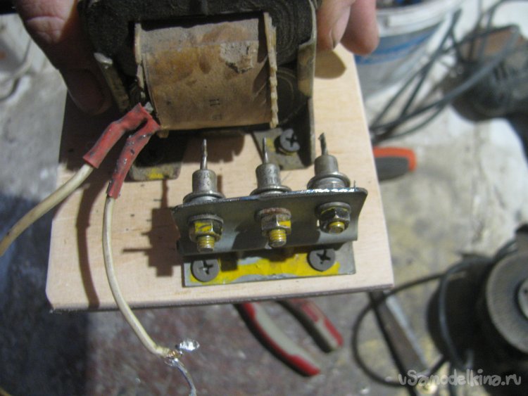 Вырезал кусок фанеры, тут мне понадобилась болгарка с диском от циркулярки. Прикрутил к основе трансформатор саморезами. Также выгнул железку и просверлил отверстия для диодов, крепко закручиваем гайки и вот они на месте. Те контакты, что на гайке, уже объединены в единый через железку, а задние спаиваем проводком. Припаиваем один из проводов через диоды. В итоге на выходе получаем пульсирующий ток (половинку синусоиды).