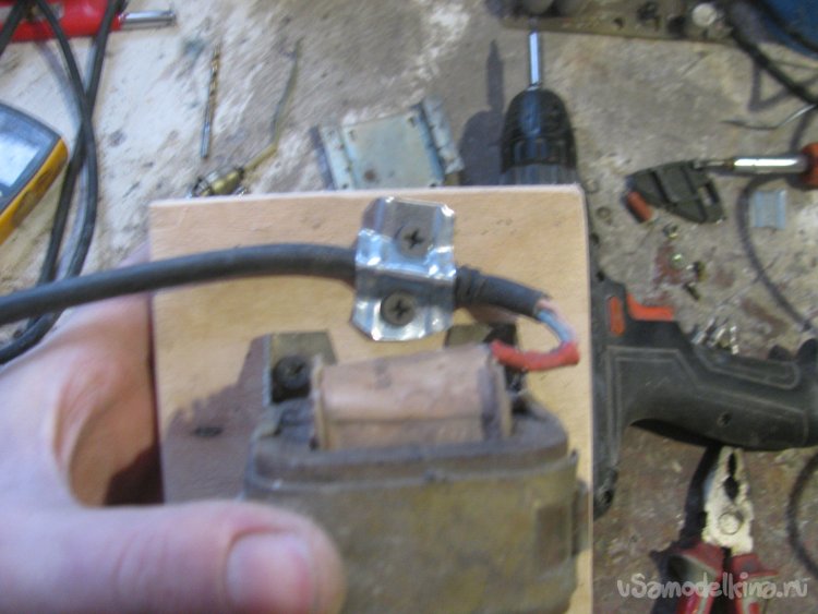 Входной и выходной кабели прикручиваем к основе саморезами и кусочками листового металла, чтоб не вырвало.