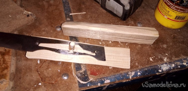 Идём обратно в мастерскую и совокупляем набойку и рукоятку, я это сделал двумя гвоздями.