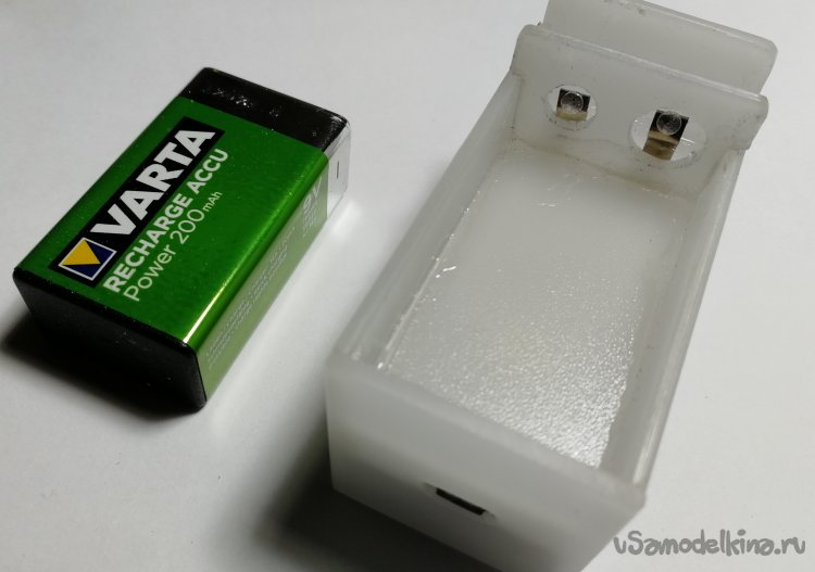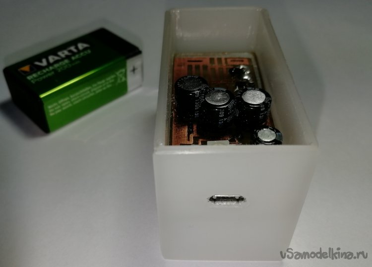 Корпус изготовлен из 2 мм. листа тыльного рассеивателя молочного цвета от неисправной ЖК матрицы телевизора, что позволило не выводить индикацию на поверхность корпуса. В качестве дополнительной защиты от переполюсовки перед контактами для подключения батареи предусмотрена перегородка с отверстиями, соответствующими диаметру клемм аккумулятора. Габаритные размеры с установленным аккумулятором - Д/Ш/В = 64/31/38мм. Некоторые этапы изготовления корпуса и демонстрация режимов индикации приведены на картинках.