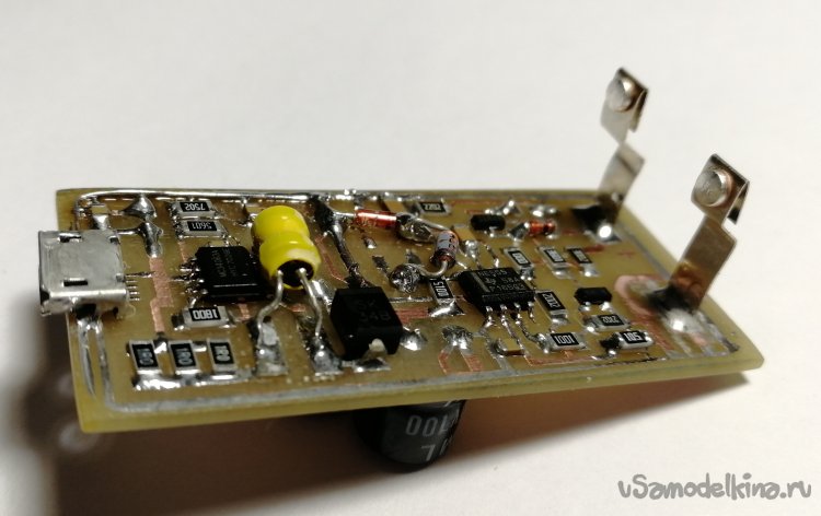 Устройство собрано практически полностью на SMD компонентах, так как хотелось получить не превышающую размеры аккумулятора печатную плату. Выводные детали - это электролитические конденсаторы и стабилитроны (для приведенного рисунка платы. Плата двусторонняя, незанятые элементами отверстия - проходные, их нужно соединить сквозной перемычкой. Первым собирается преобразователь, после проверки которого - остальная часть схемы. При разводке своей печатной платы стремитесь в обвязке MC34063 придерживаться топологии, приведенной в документации производителя.Вся наладка сводится к проверке работоспособности преобразователя, измерению тока, который не должен превышать допустимый для вашего типа аккумулятора и к установке порогов включения/отключения зарядного тока.