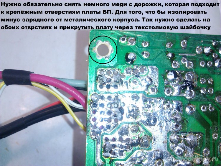 Дальше обязательно нужно подрезать дорожку вокруг 4 крепёжных отверстий платы и прикрутить плату подложив 4 текстолитовые шайбочки, это необходимо для того что бы полностью изолировать корпус ЗУ от минусового провода зарядного.