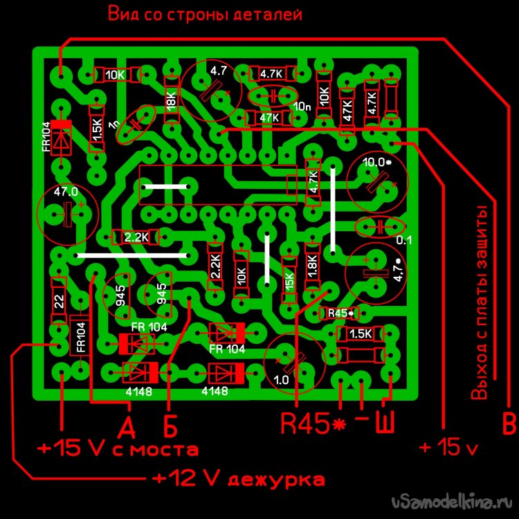 R45* - параллельно потенциометру регулировки тока, установка минимального тока 1 А при минимальном зарядном токе(нижнее по схеме положение потенциометра R45).
