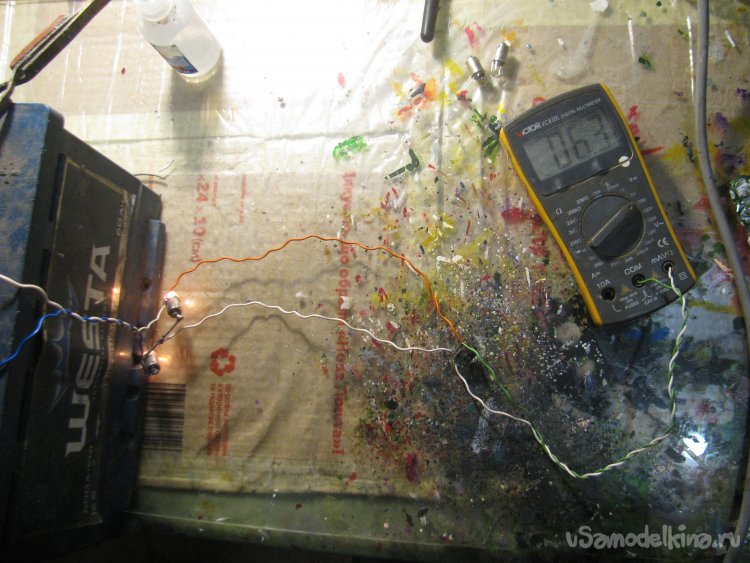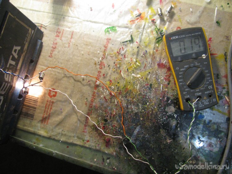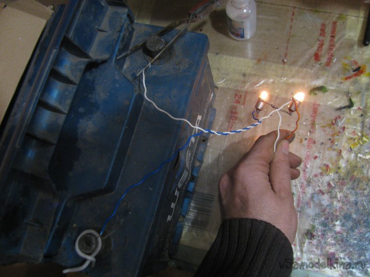 Первым делом соединяем лампочки, они у нас одинаковой мощности по 3Вт. Лампы подключаем последовательно, в итоге каждая из них должна гореть в полнакала! Как итог, припаиваем один провод между лампами, в этом месте будет падение напряжения, в нашем случае оно делится пополам и составляет 6.3В, так как полностью заряженный АКБ после простоя имеет напряжение примерно 12.6В.