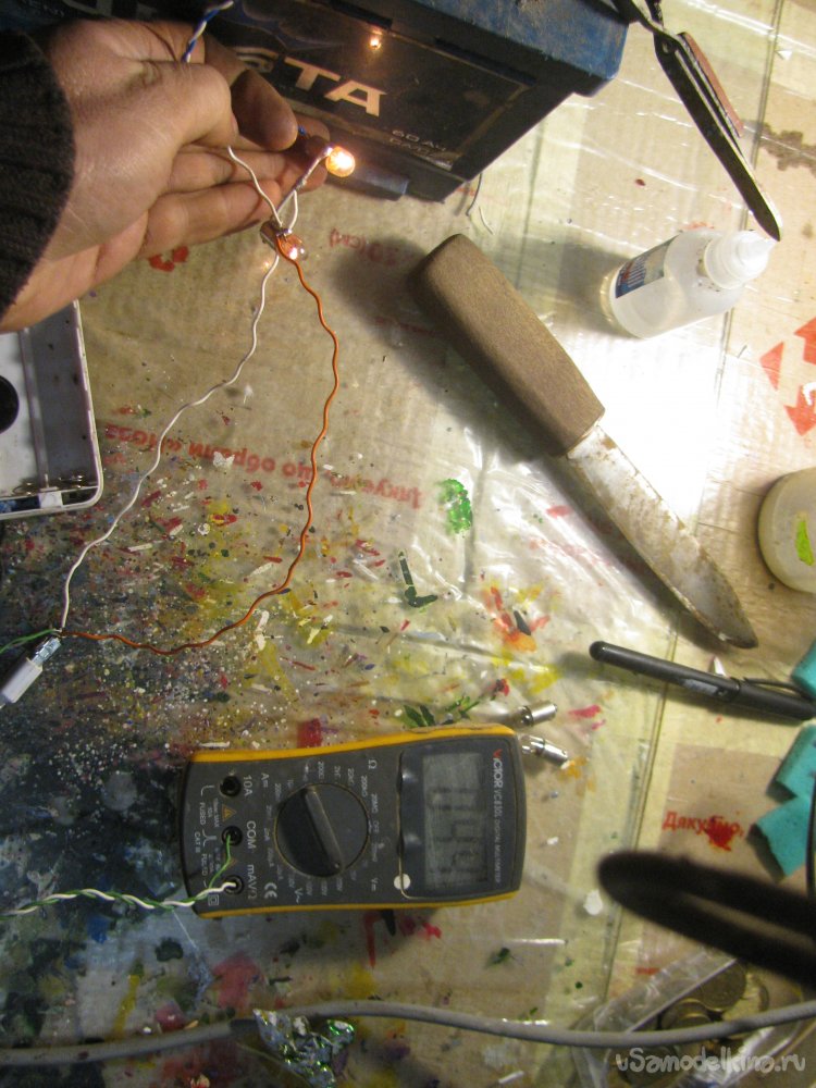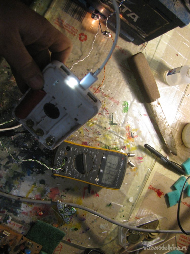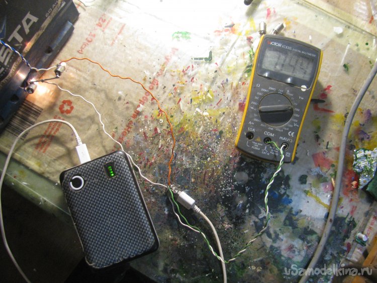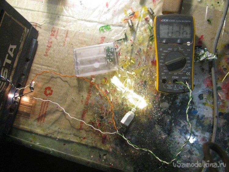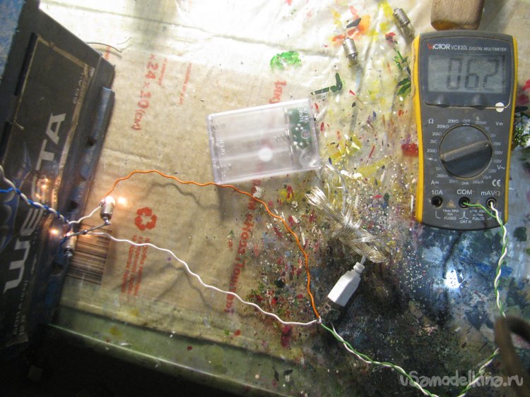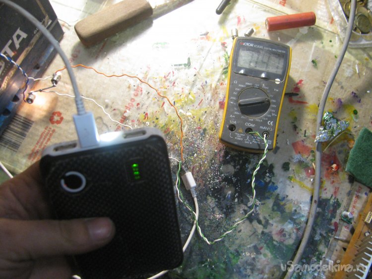Также я подключил USB-гирлянду, она кушает немало, напряжение упало до 3.6В, но светит вполне себе ярко.