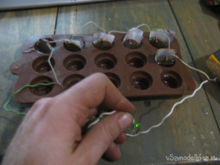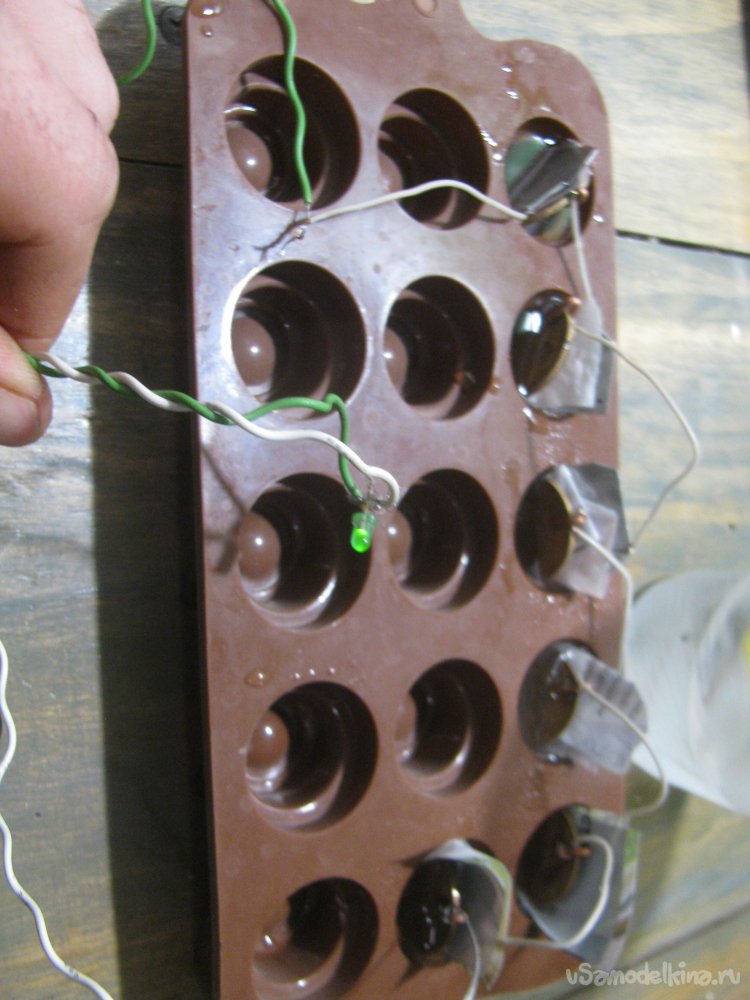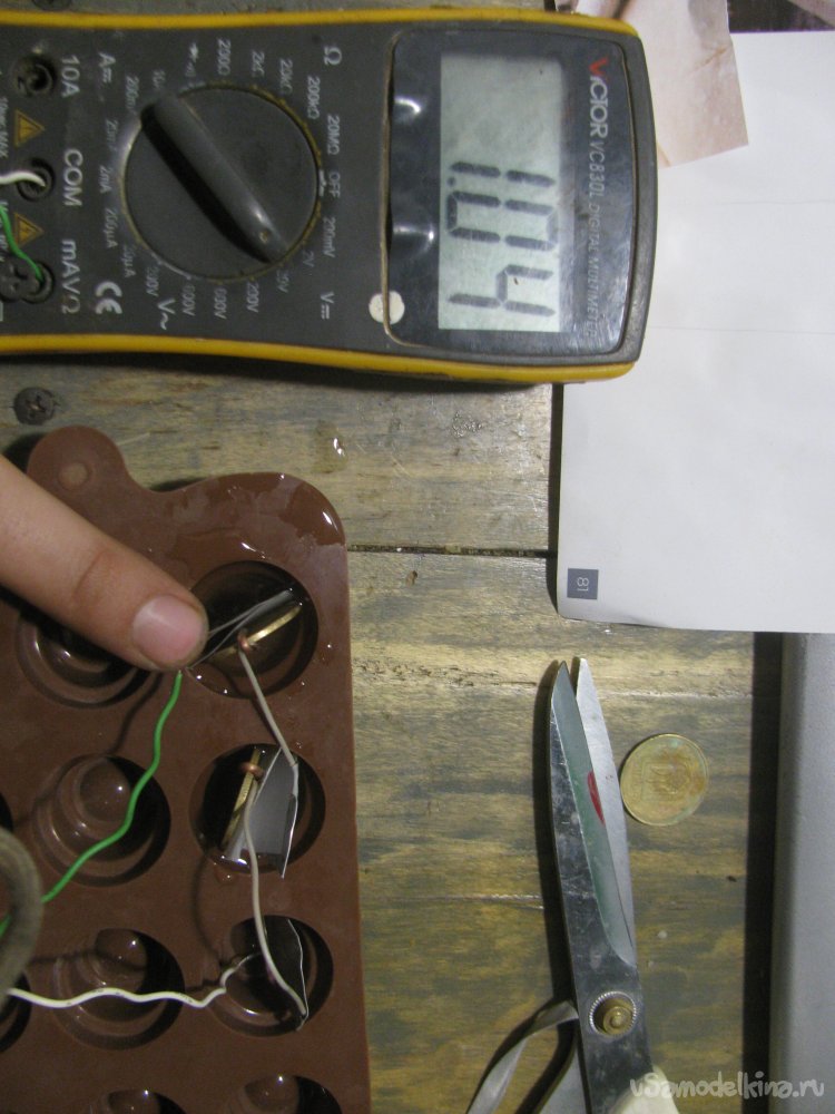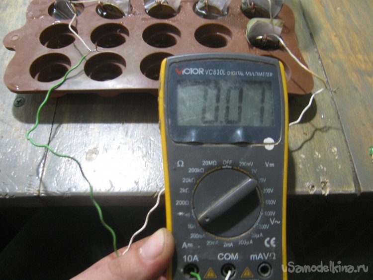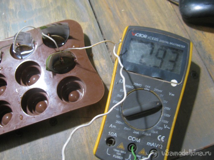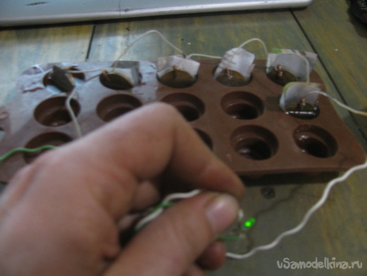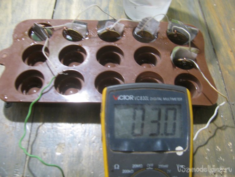 Напряжение на одной ячейке составляет около 0.5В, а на двух уже не менее 1В, значит, можно собирать дальше. Величина напряжения определяется активностью металла, если бы это был цинк, оно было бы выше. Все ячейки собираем последовательно, для увеличения напряжения. Отлично для этого подошла силиконовая формочка.