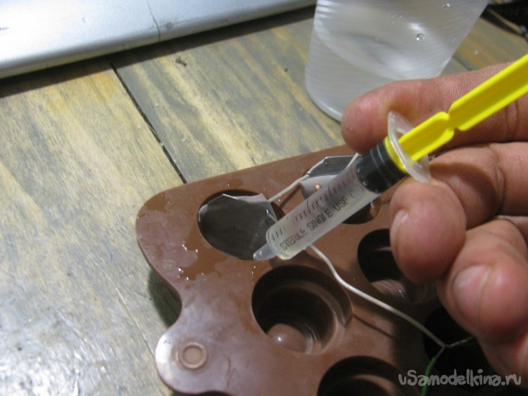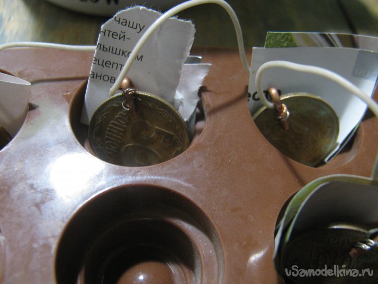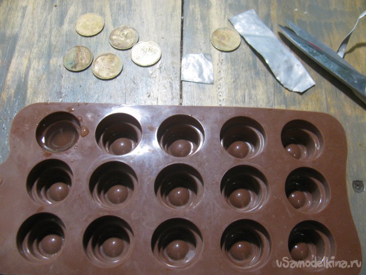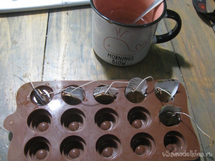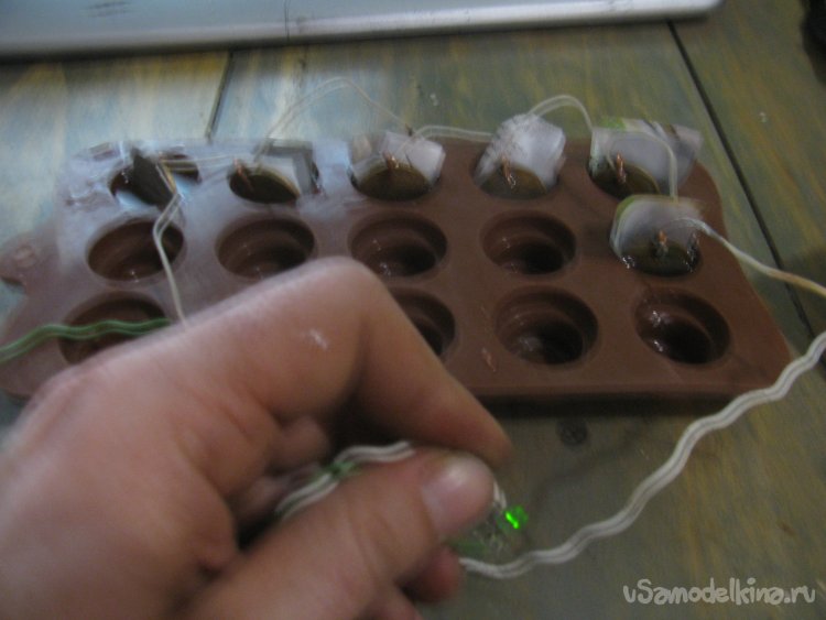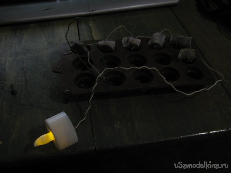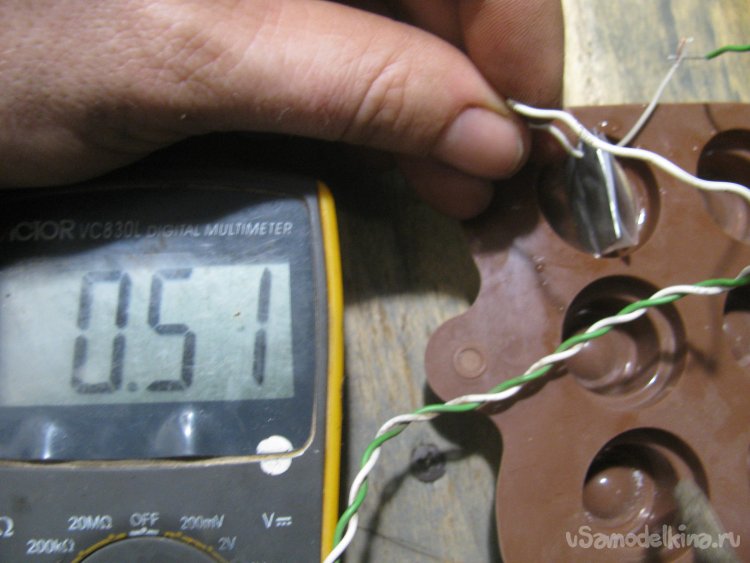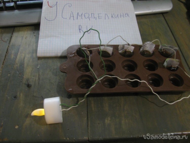 Напряжение на одной ячейке составляет около 0.5В, а на двух уже не менее 1В, значит, можно собирать дальше. Величина напряжения определяется активностью металла, если бы это был цинк, оно было бы выше. Все ячейки собираем последовательно, для увеличения напряжения. Отлично для этого подошла силиконовая формочка.