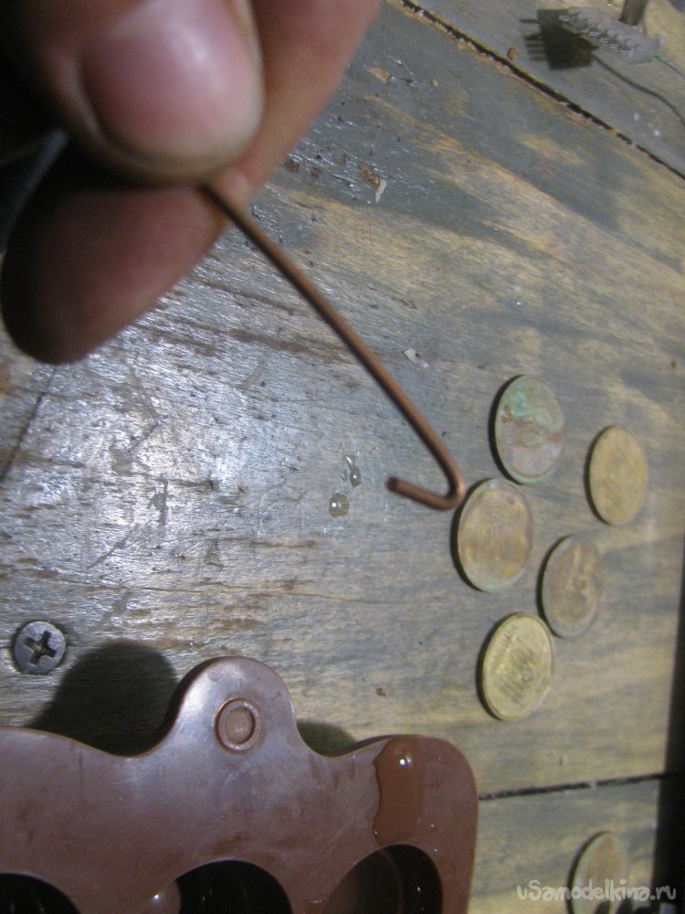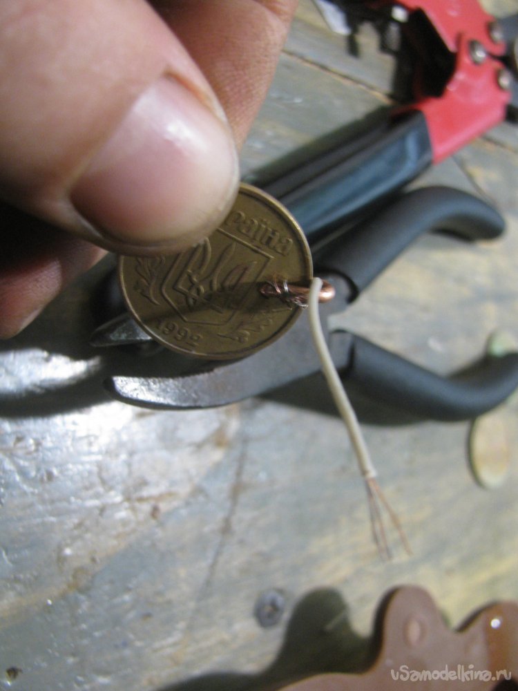 Из медной проволоки делаем зажимы для монет, в идеале их можно припаять к проводам, но возиться не захотел. Такое соединение не очень хорошее, так как контакт слабоват, а еще тут могут возникать разные потенциалы и может теряться напряжение. К алюминию проводок крепим подобным образом, сгибая и затем зажимая лист плоскогубцами.