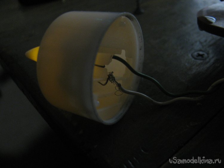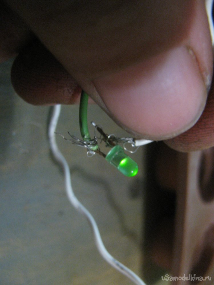 Первым делом я залил соленую воду, напряжение постепенно поднялось до 2.93В. Амперметр не показал ничего, а мА у меня не работает. Ну что ж, попробовал зажечь маленький светик зеленого света. В темноте светит еле заметно, пошевелил контакты, результата нет.