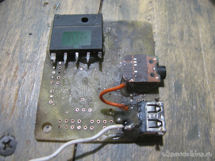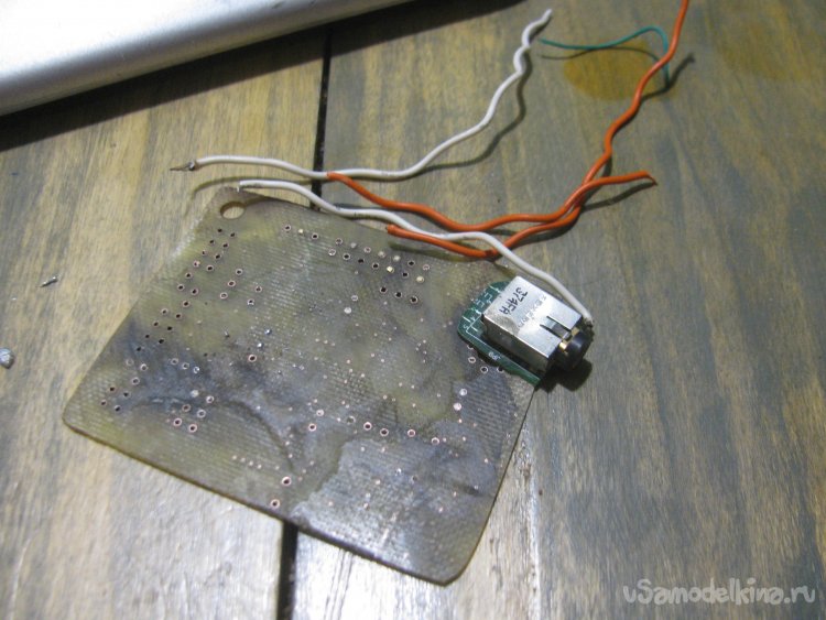 Приклеил к основе микросхему, а также гнездо 3.5 и гнездо USB. Ну а далее припаиваем провода по схеме. Даже в такой простой схеме я как совсем новичок разок ошибался.