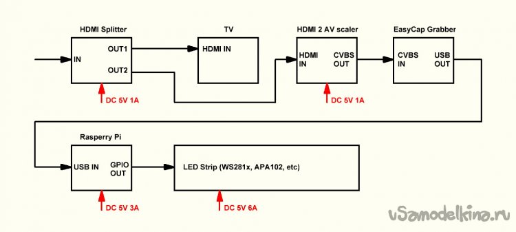 Некоторые необходимые компоненты для отладки этого варианта на фото. Это – Raspberry Pi B+ , HDMI-2-AV скейлер, активный HDMI сплиттер, USB граббер EasyCap, кабели HDMI, патчкорд для LAN соединения, соединитель папа-папа «тюльпан», источник питания 5В, microSD карта 32гб 10 класс. Кроме этого нужны - кардридер для microSD, USB мышка и клавиатура, какой либо монитор с HDMI входом или DVI + переходник HDMI-DVI, USB и HDMI кабели для подключения всего этого.Мышка, клавиатура и монитор для малины – опционально, потому что все можно настроить через SSH с консоли и файлового менеджера. Из перечисленного железа – скейлер HDMI2AV понимает входной сигнал с разрешением до 1080P, значит для обработки входящего 2К и 4К сигнала непригоден. Для более высоких разрешений есть другие скейлеры, принимающие 4K и позволяющие на выходе получить приемлемый сигнал. Для питания 5V ленты и малины использовал БП Sony 7,6В 2А от какого-то устройства, которым питал инвертор из Китая, имеющий на выходе 5V при максимальном токе до 8А, как заявлено в описании. Для отладки с лентой WS2812B на 91 пиксель этого вполне хватает. Структурная схема соединений всех блоков будет такой: