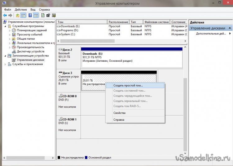 6. Затем идем в Управление компьютером -> Управление дисками, тыркаем в наш правой кнопкой, создаем раздел, кликаем ОК, назначаем букву, имя тома.