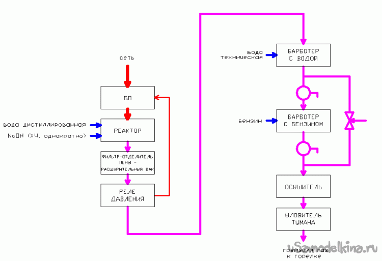 Электролизер для получения гремучего газа не является и весьма простым аппаратом превращающим воду в горючее - это сложный прибор требующий расходных материалов (ряд химикатов, электричество), внимания и регулярного обслуживания. Необходимо хорошо представлять процессы происходящие в электролизере, способы и средства для изменения параметров прибора. Кроме самого реактора - емкости с электродами разлагающими воду из электролита, электролизер должен быть снабжен рядом дополнительных аппаратов для очистки и осушения газа, обогащения его углеводородами (важно при сварке), блоком питания с автоматикой поддерживающей рабочий режим и устройствами безопасности (Рис. 2).
