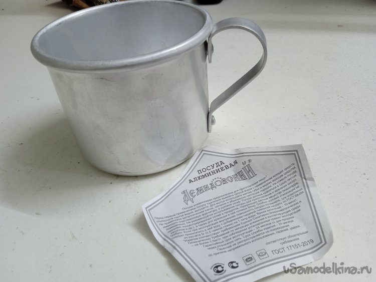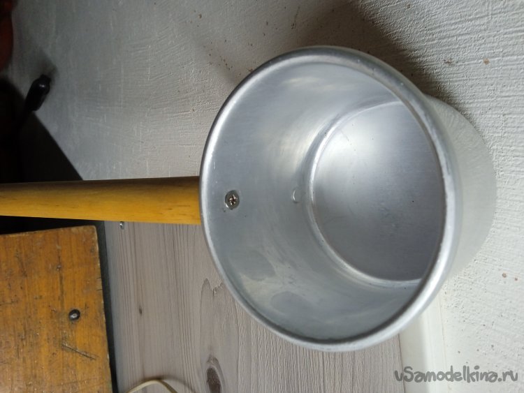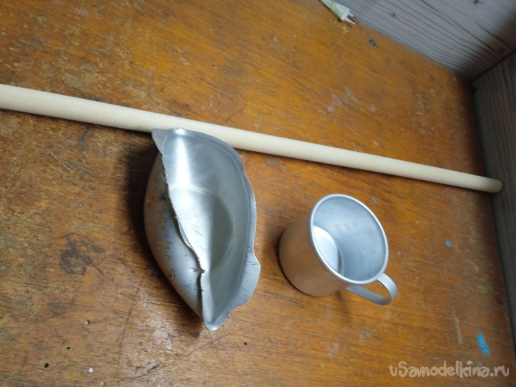 Основу ковшика решил сделать из алюминиевой кружки, которую и приобрел в магазине Фикс прайс за 100 отечественных. Черенок у меня уже был, даже не помню, для чего приобретал его. В мыслях было так – убираю штатную ручку с заклепками у кружки и приклепываю самодельный фланец с держателем для черенка – ручки, вот и все дела. Пригодилась для фланца алюминиевая собачья миска - «шлемка», торжественно попавшая из под снега в ДТП со снегоуборщиком, и выкинуть которую, как материал, «рука не поднялась».