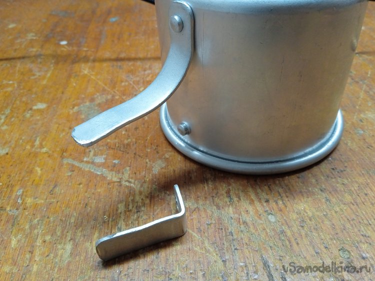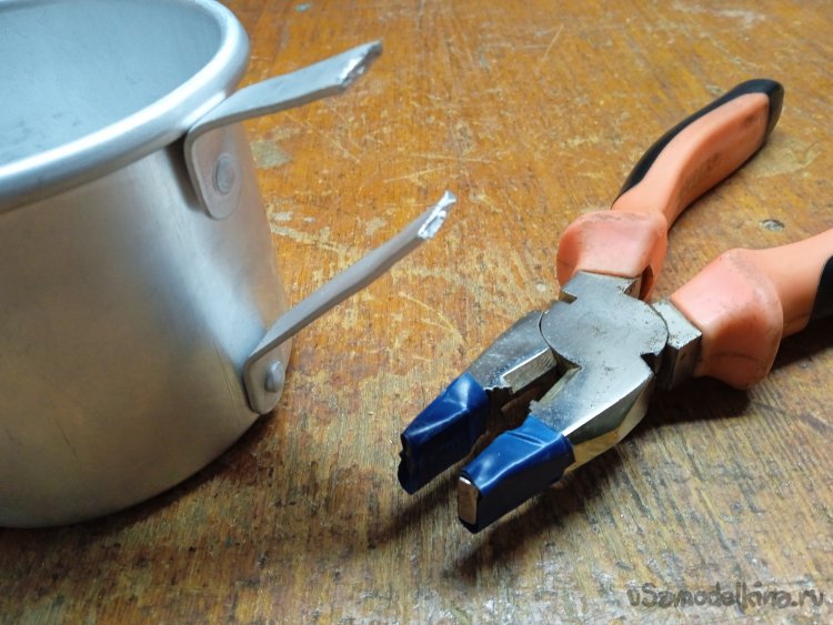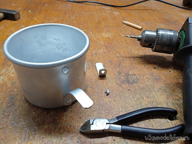 Решил просто разрезать ручку кружки, выгнуть получившиеся полоски по месту к черенку и просверлив два сквозных отверстия рядом, вдоль оси, в металле и дереве, закрепить это все болтами - стяжкой сверху и снизу. Так и начал делать.
