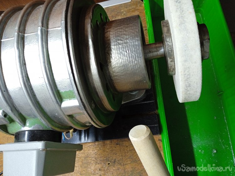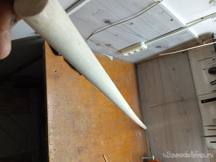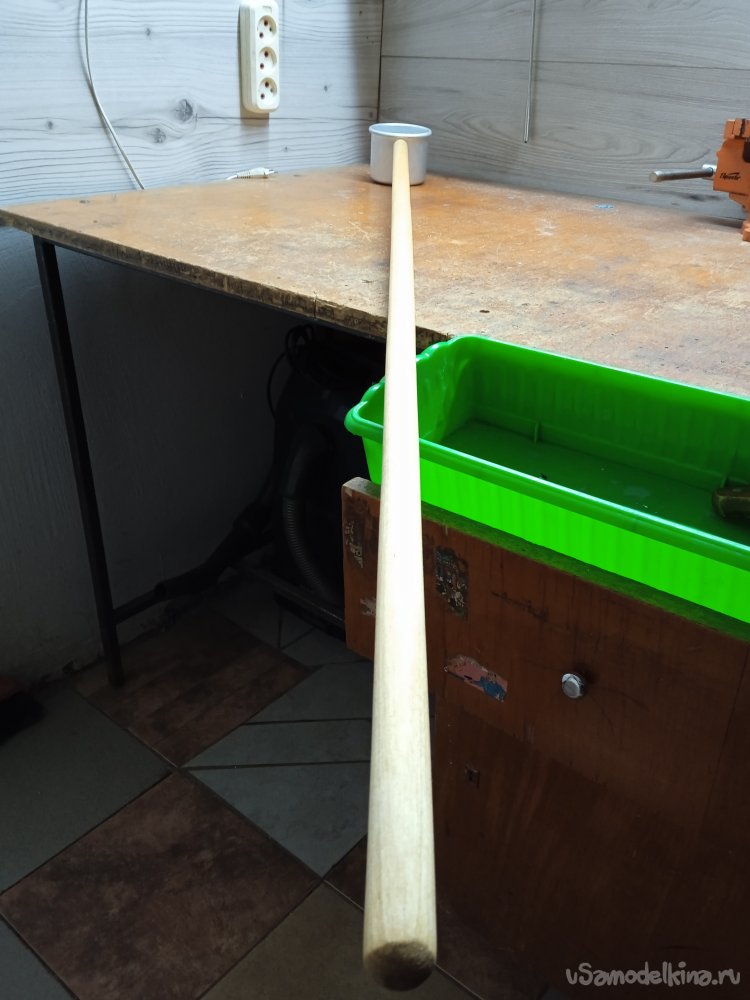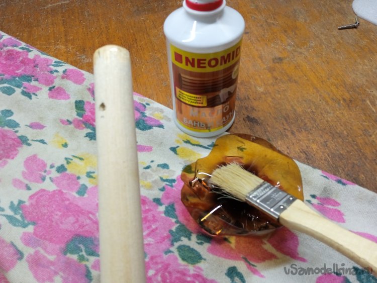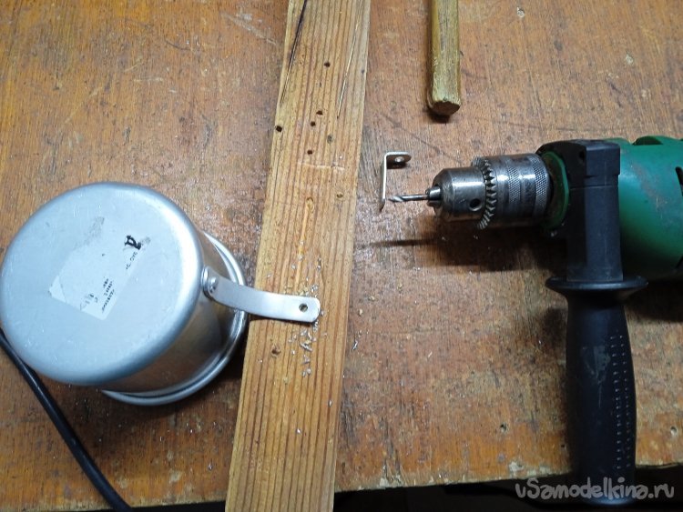 Обработал торцы черенка на наждаке. Определил места крепления черенка к кружке, изгибом кверху. Просверлил контрольные отверстия в торце и сбоку, по разметке уже имеющихся отверстий в металлической части будущего ковшика. Покрыл, теперь уже ручку ковшика, защитным составом -маслом для полков.