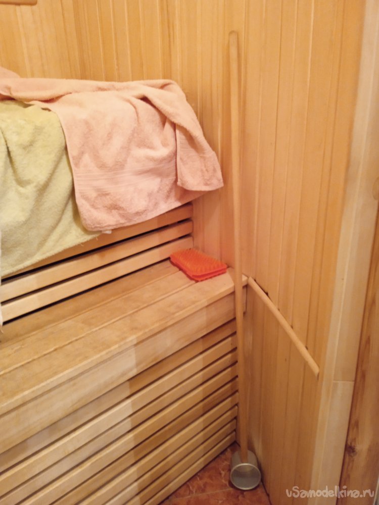 Полки в парной конструктивно высокие, и чтобы поддать пару, нужно спускаться к запарнику, брать ковш и плескать на камни, а потом быстро заскакивать обратно, «догонять пар».