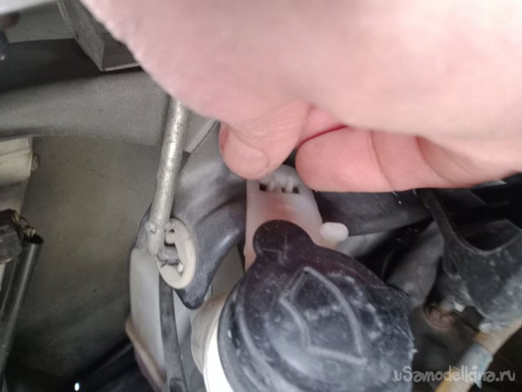 1. Снимаем с крепления заливную горловину, зажимая защёлки пальцами и одновременно выдёргивая горловину от крыла в сторону двигателя.