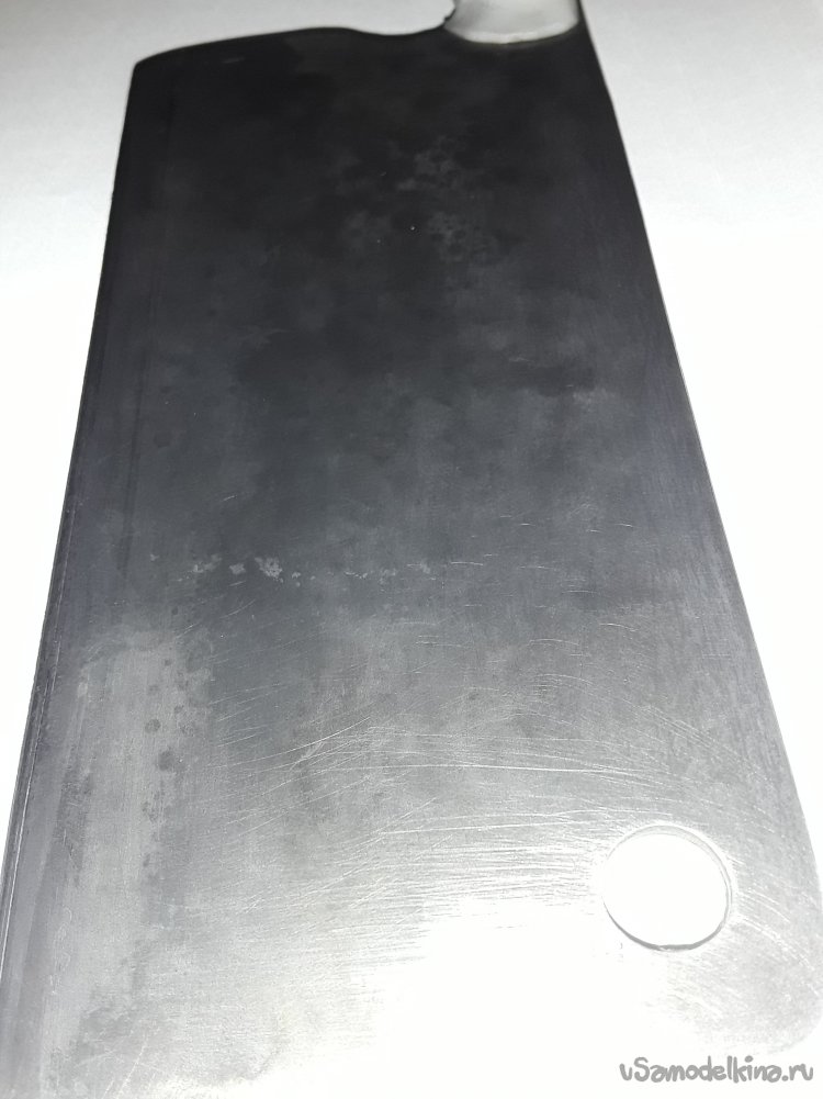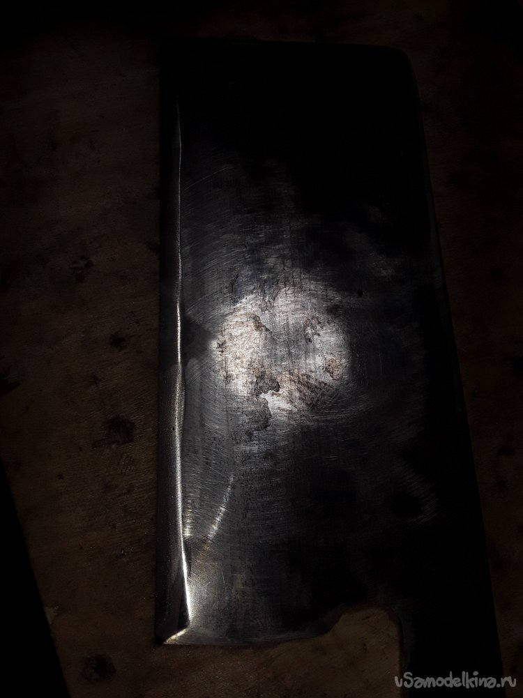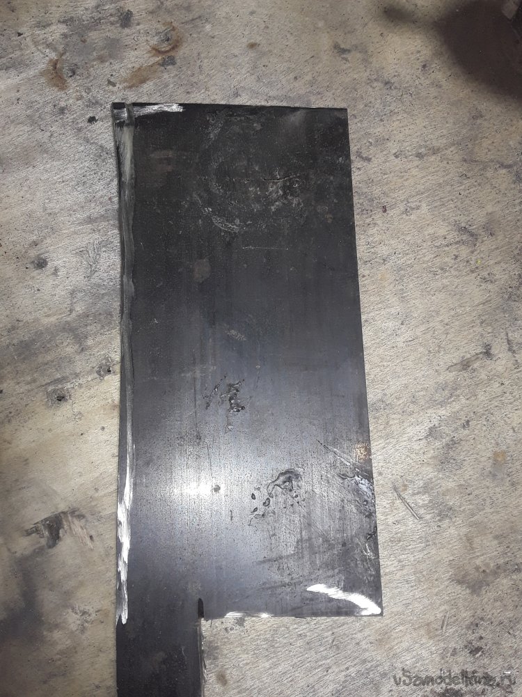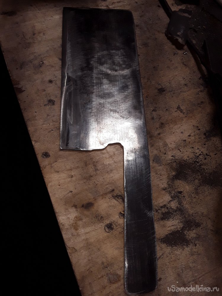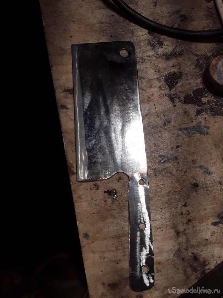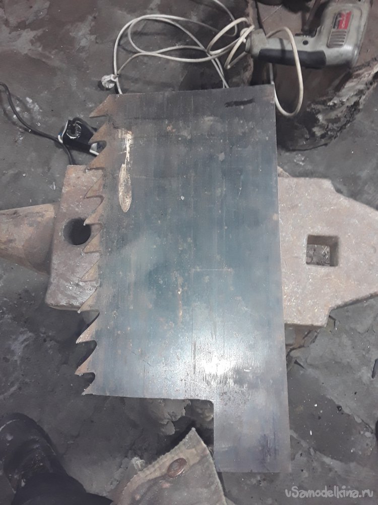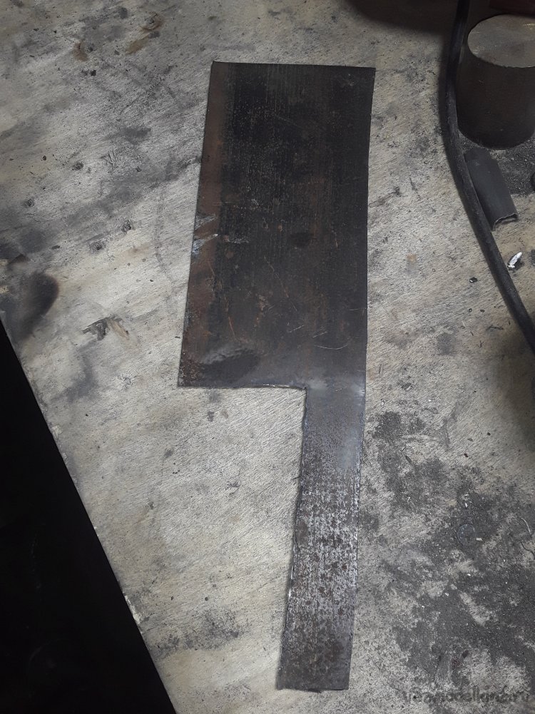 Здравствуйте друзья давно не виделись надеяться у вас все хорошо. В сегодняшней статье я хочу рассказать про процесс изготовления кухонного ножа топорика для серьезных работ с мясом и не только. Для такого ножа так как он работает в агрессивных средах нужно использовать нержавеющую сталь, но к сожалению имеющиеся стали у меня не подходят так как после закалки они все равно будут гибкими при такой толщине. А со шх15 нет возможности разобрал горн на плановый осмотр. Для ножа нашел кусок от какой-то пилы шириной 20 см не знаю что за пила кто знает написать в комментариях в общем она та и подходит для топорика. Сталь очень прочная ее толщена 2.5 мм такая сталь имеет маркировку р6м5 в народе ее называют быстро рез она при работе с мягкими материалами долго держит заточку и на изгиб упругая. И так предисловие считаю законченным, приступаю к делу.