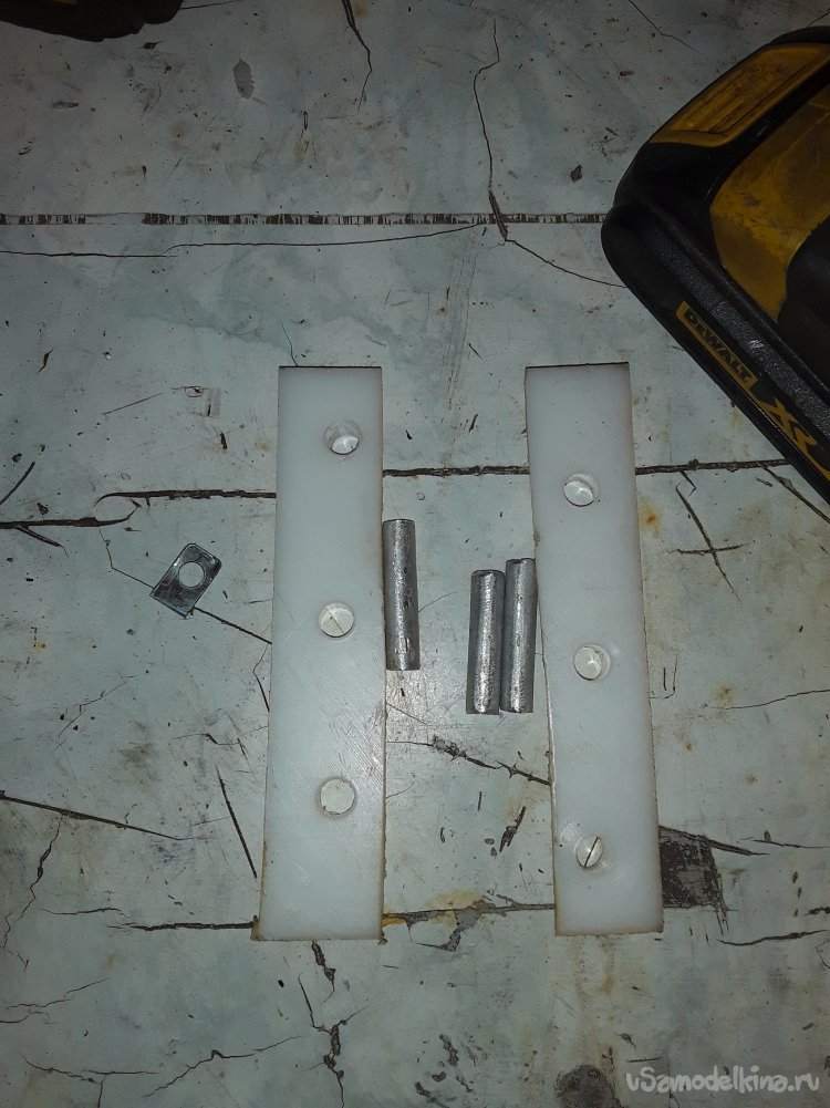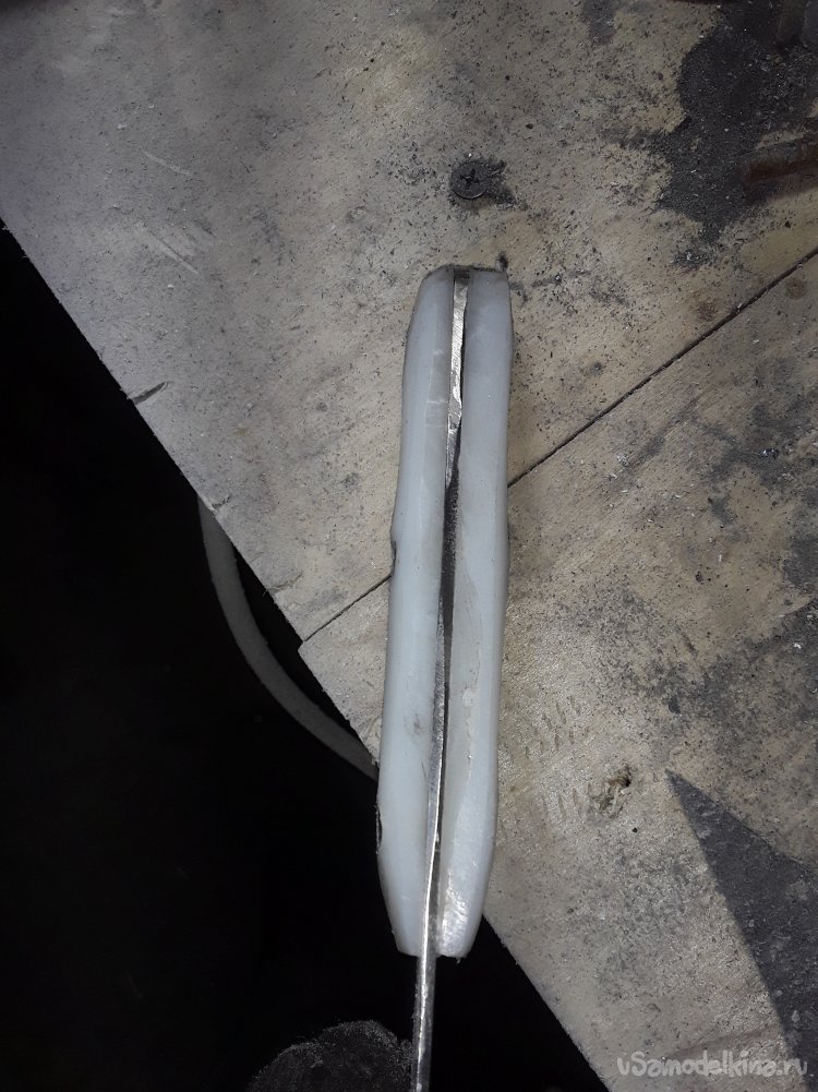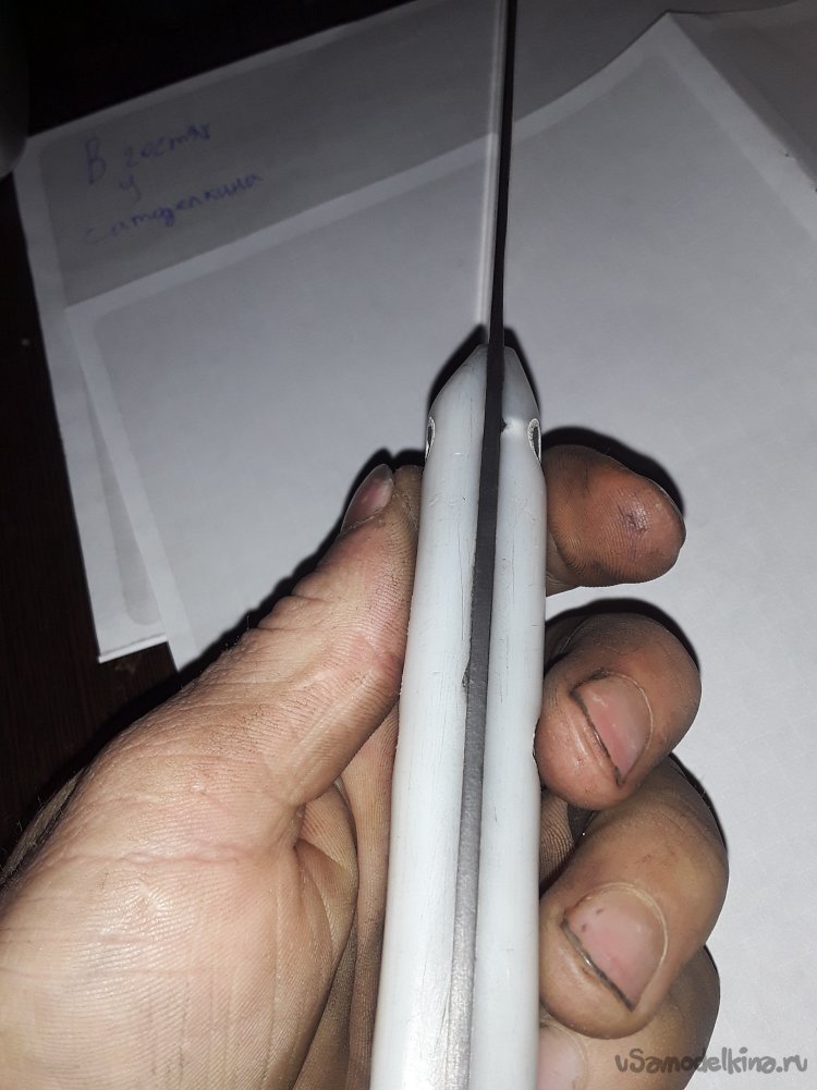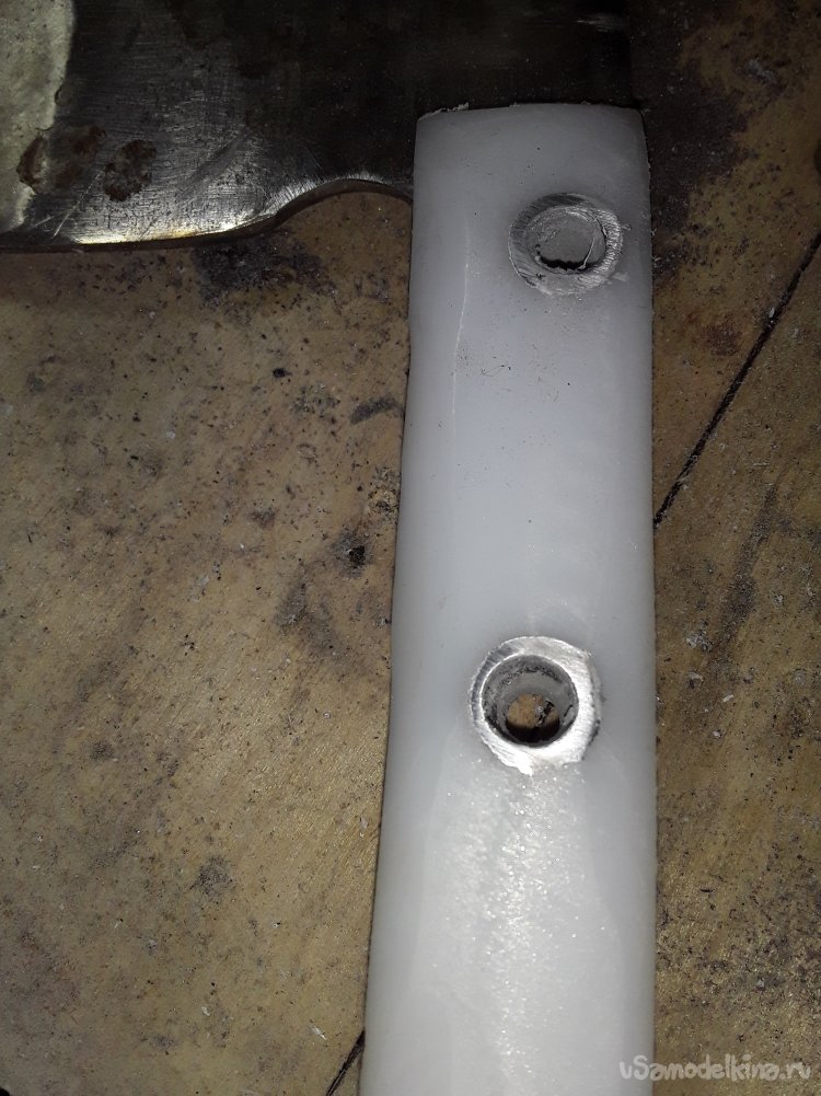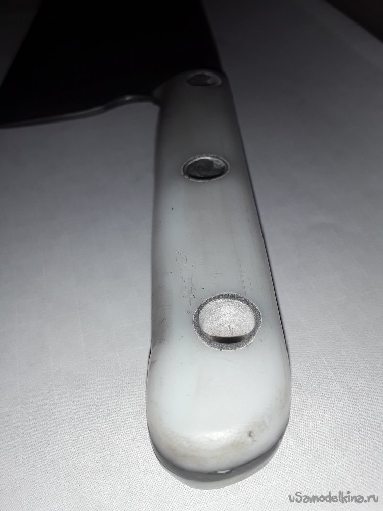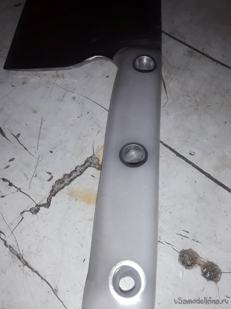 Теперь пришло время для изготовления рукояти для этого решил не использовать дерева так как нож будет часто сырым, а дерево очень хорошо впитывает запахи. Для рукояти нашел кусок пластика не знаю что за пластик, но он очень прочный я его когда пилил болгаркой летели мелкие искры. Такой пластик ставят там где постоянно происходит трение. Толщина пластика 5мм сделав разметку отрезаю полоски и просверливаю отверстие на 6 мм для заклепок. Там где лицевая сторона немного развальцован пластик на 9 мм чтобы заклёпке было куда расширятся. Сами клепки можно использовать какие захотите я для них нашел трубку алюминиевую медных не нашел ну ни что и такое пойдет. Отрезав прям по толщине рукояти без запаса трубки начинаю развальцовывать для таких целей так как я редко делаю накладные ручки у меня нет пришлой думать. В мастерской нашел шарики от подшипника 8 мм поставил их на трубку и немного зажал в тиски главное не сильно иначе шарики так застрянут что вытащить будет очень тяжело так я промучился с центральной трубкой. После развальцовкой всех 3‐х нашел подходящего диаметра саморез дюбель и отрезал от них шляпки они как раз подходят. И так же обжал все 3 трубки получилось прикольно, а самое главное крепко и симпатично.