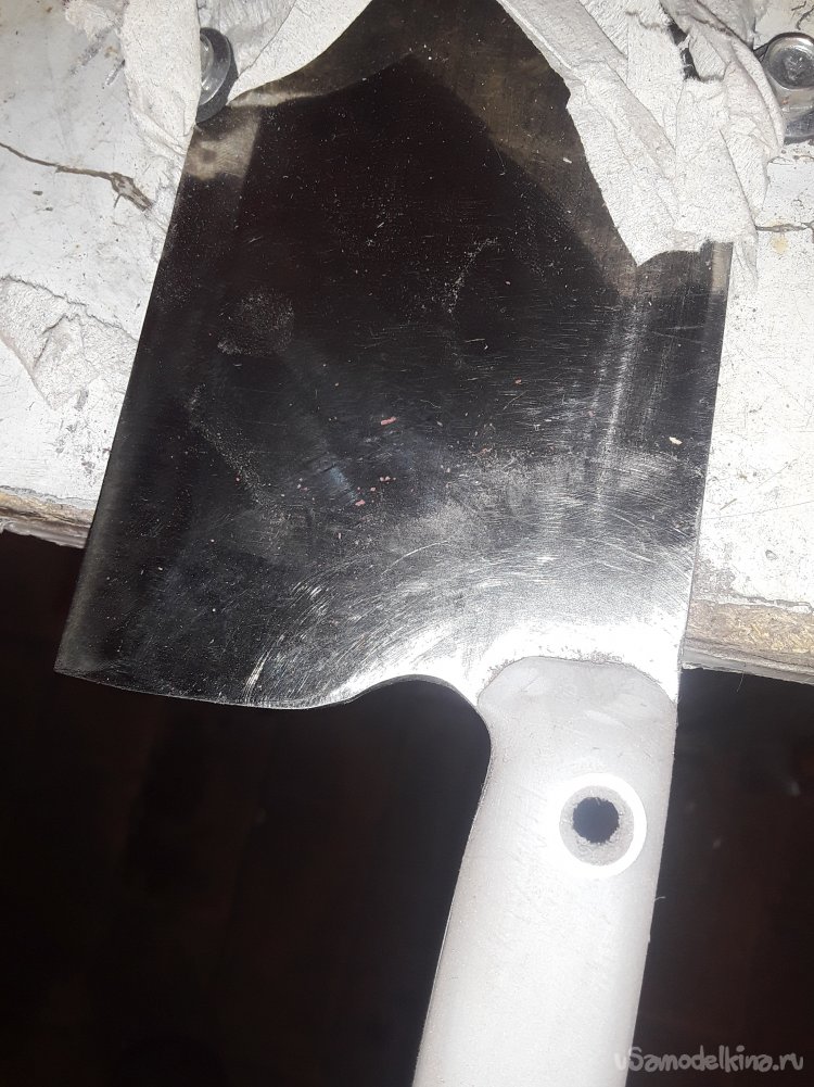 После 30 минут аккуратной работы я получаю заготовку топорика теперь для придания эстетичного вида немного шлифую лепестковым кругом 200го зерна. Местами осталось заводское чернение ну ни чего страшного полировать до зеркала не имеет смысла все равно нож буду травить. После шлифовки обрабатываю все края кроме рукояти там не нужно закруглять ничего так как после монтажа рукояти будет щель. А теперь самое интересное это сверление. Пару лет назад я уже имел опыт с таким металлом. Тогда мне нужно было просверлить 3 отверстия ох и я намучился часа 4 сверлил столько сверл переломал, а нервов еще больше. Сам метал мне, понравился, а вот сверление надолго отбила желание делать нож с р6м5. В итого просверлив одно отверстие остальные 2-я прожог сваркой. На следующий день встретил друга и рассказал о горьком опыте сверление он немного посмеялся, и сказал что нужно сверлить победитовым сверлом по бетону я конечно не поверил так, и прошло время. А вот сейчас вспомнил его слова и купил себе новое сверло с победитовым наконечником одно 10 мм, а второе для рукояти на 6мм. С огромной неохотой думая что сверлится будет очень тяжело, но нет гораздо легче чем в прошлый раз. Для подвески топорика просверлил для гвоздика отверстие с краю на 10 мм, а на ручке три отверстия на 6 мм сверлилось недолго без особых усилий. После сверления позвонил другу и сказал спасибо за секрет сверления пилы.