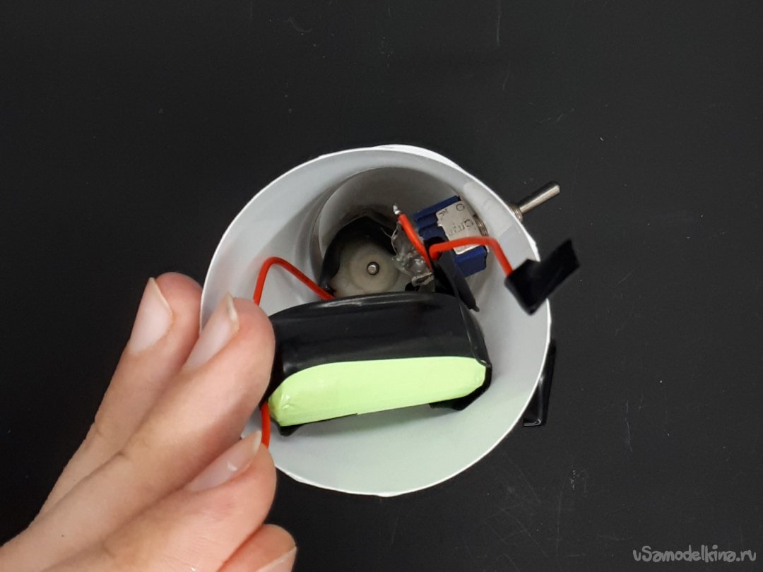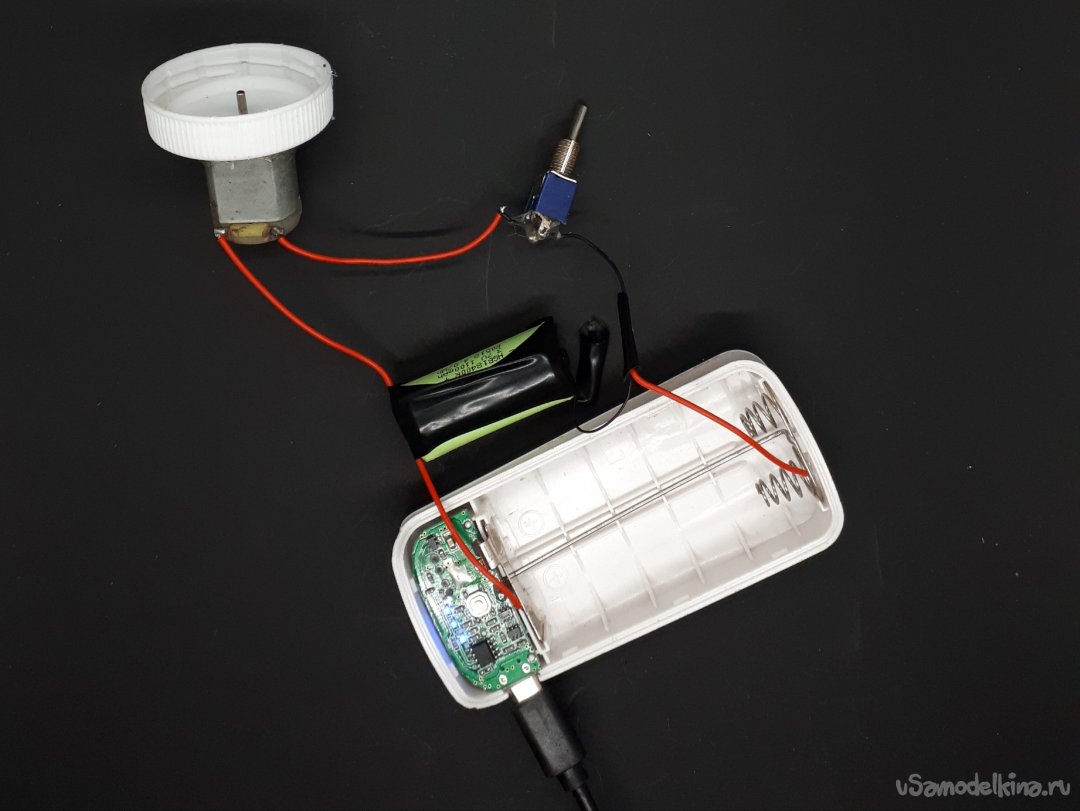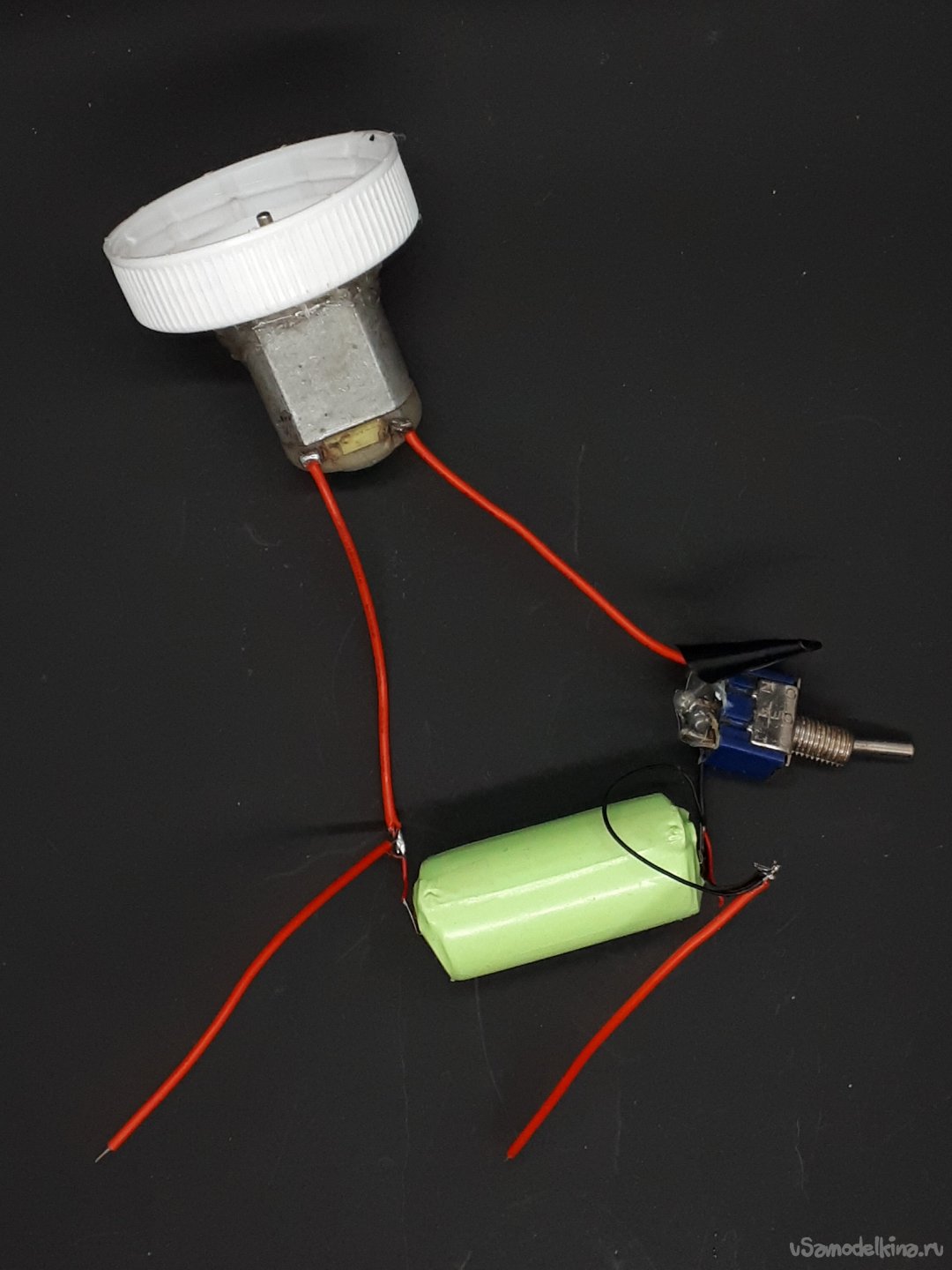 По сути, просто нужно подсоединить мотор к батарейке с выключателем, а также, если у вас аккумулятор, вывести 2 провода, для возможности подзарядки без разбора конструкции.
