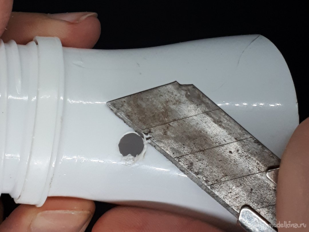 4. Берём основу, и если у вас те же расходники, что и у меня, то сверлим отверстие под диаметр вашего выключателя(у меня 6 мм) чуть ниже края утолщения(если у вас другой мотор, сверлить нужно на таком расстоянии, чтобы выключатель не касался мотора). В месте сверления можно сделать дырочку ножом, без этого отверстие сверлить очень долго.