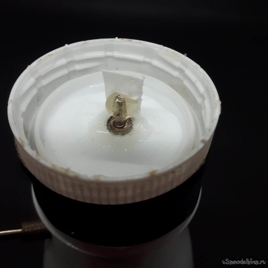 Примечание: Лучше не переборщить с клеем, поскольку в перевёрнутом виде крышка должна плотно прилегать к краю резьбы, и не обязательно наносить термо-клей по всему периметру, так как место стыка крышки и мотора герметично и без клея.