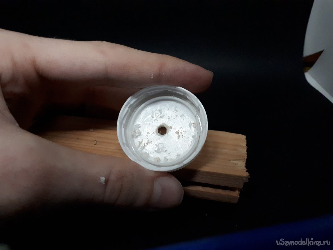 2. Кладём крышку на ненужную деревяшку, и сверлим под диаметр мотора, в моём случае 6 мм.