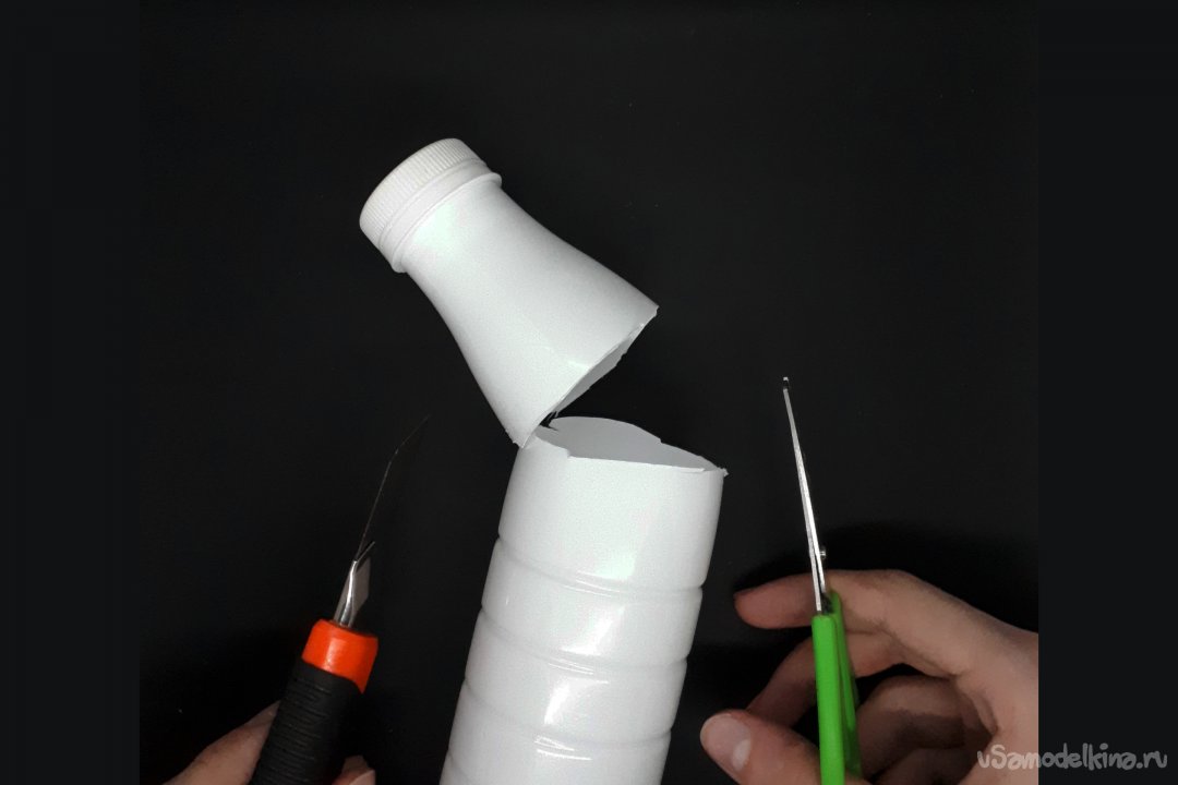 2. Грубо отрезаем бутылку ножиком и ножницами на расстоянии 6-7 см от кольца (либо чуть дальше от того места, где горлышко бутылки перестаёт расширяться, в зависимости от размера бутылки, элемента питания, выключателя и мотора), и забираем горлышко, низ убираем куда подальше, точнее, из него можно потом вырезать лопасти.