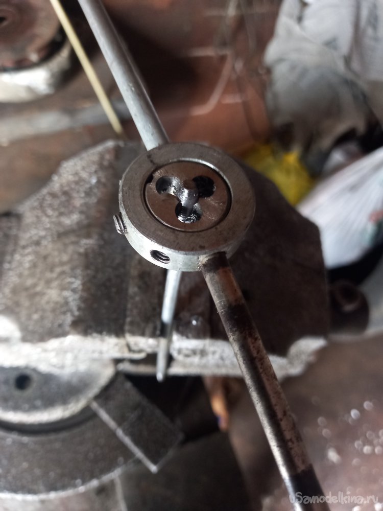 3. Далее нарезаем резьбу М5 не забыв предварительно смазать моторным маслом
