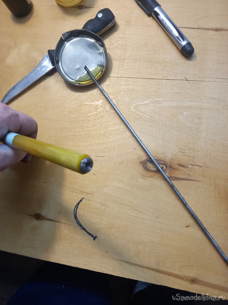 1. отрезаем ножовкой по металлу кусок лыжной палки который с пластиковой ручкой и темляком. Длина произвольная, я отпилил по сломанному 35см.